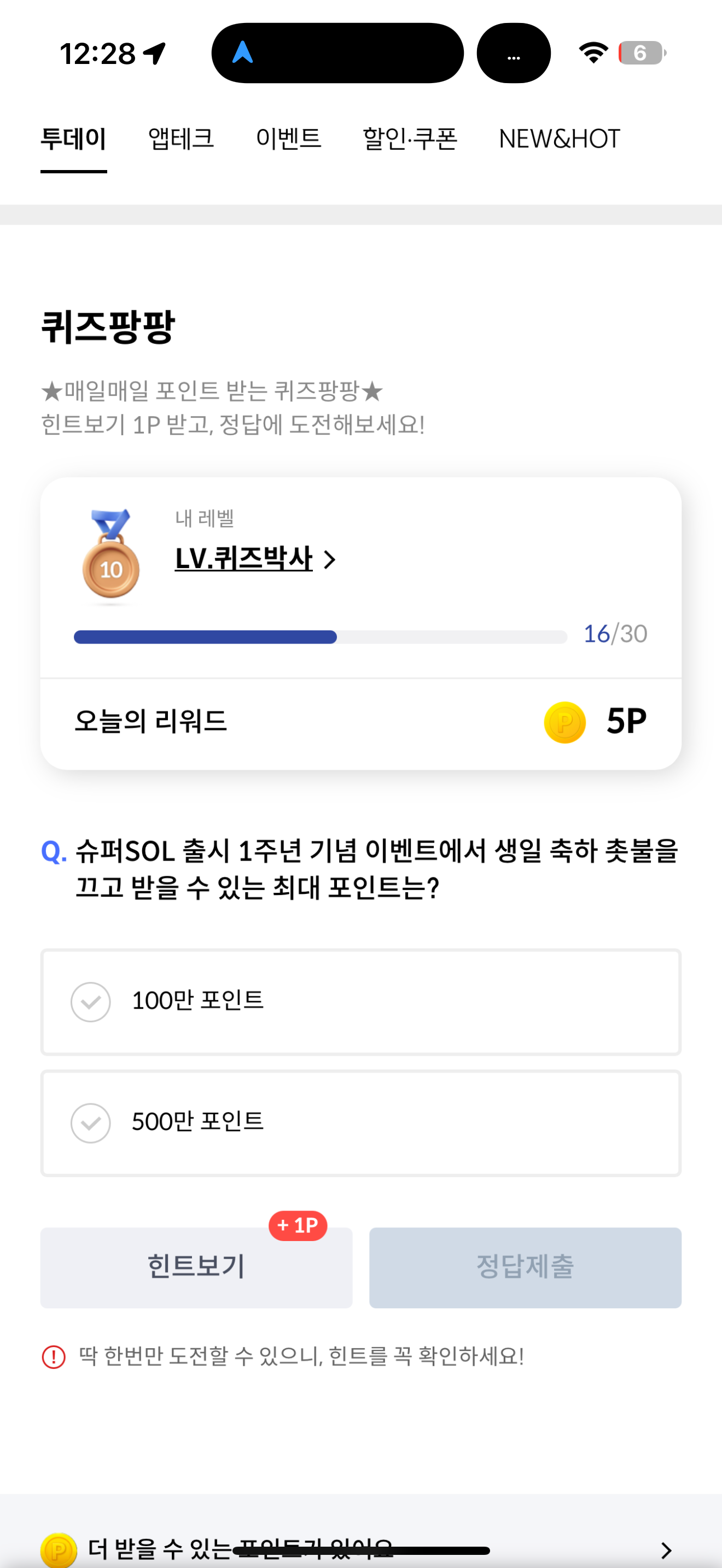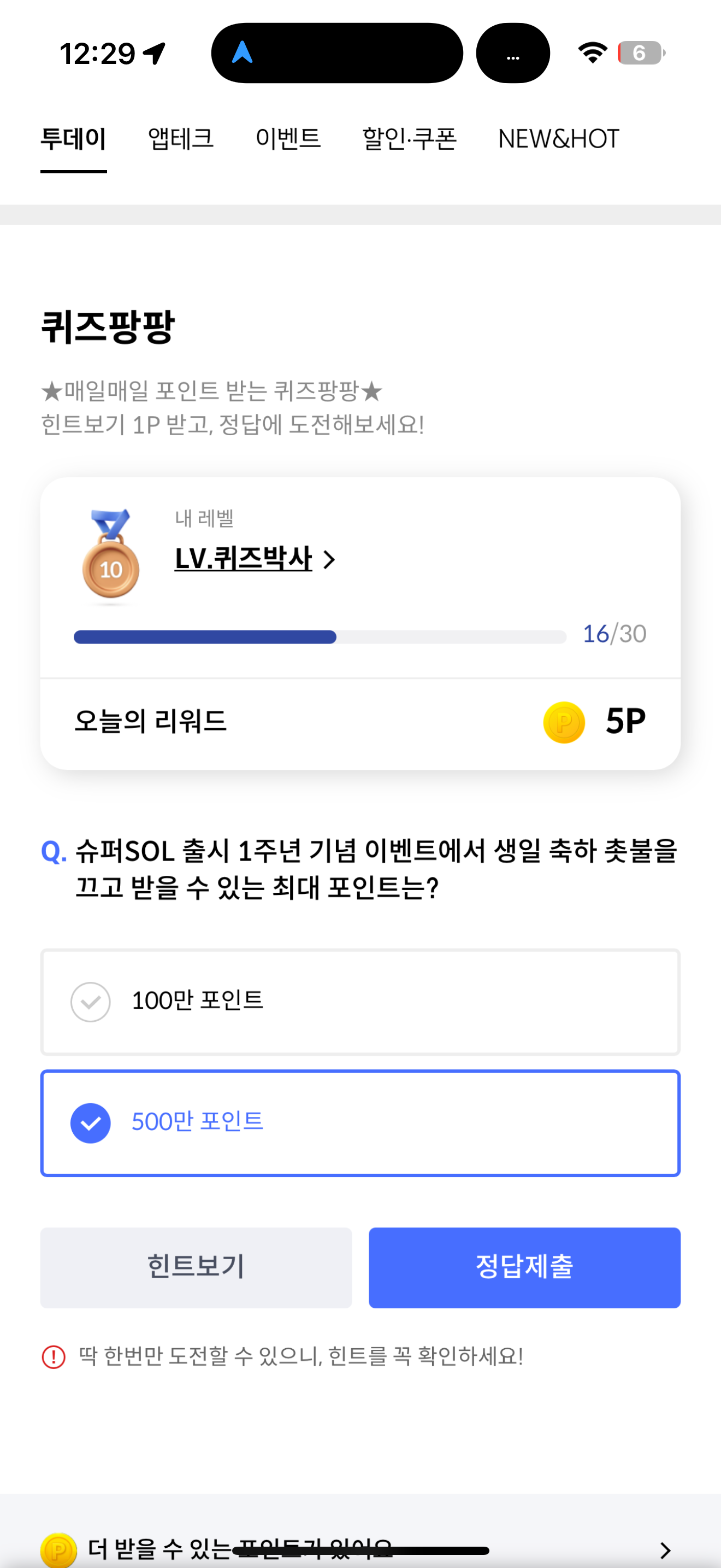 슈퍼SOL 출시 1주년 기념 이벤트에서 생일 축하 촛불을 끄고 받을 수 있는 최대 포인트는? 보기는 1. 100만 포인트 2. 500만 포인트 입니다. 슈퍼SOL 출시 1주년이 되었습니다. 파격적인 이벤트를 열고 있으니 참고해서 득템하세요! 행운이 함께 하길 바라겠습니다