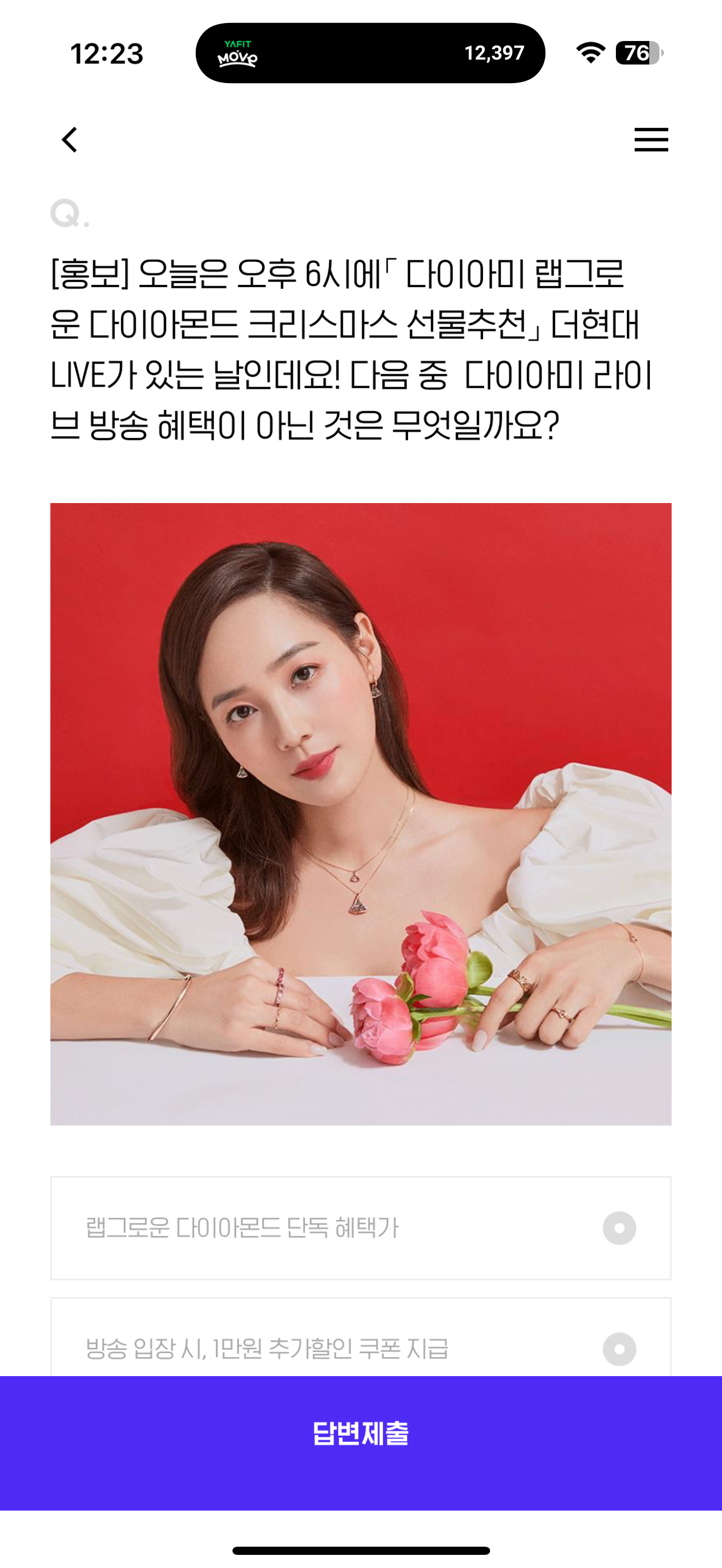 오늘은 오후 6시에 다이아미 랩그로운 다이아몬드 크리스마스 선물추천 더현대LIVE가 있는 날인데요! 다음 중 다이아미 라이브 방송 혜택이 아닌 것은 무엇일까요? 보기는 1. 랩그로운 다이아몬드 단독 혜택가 2. 방송 입장 시, 1만원 추가할인 쿠폰 지급 3. 방송중 주문번호 구매인증 시, 밍크퍼 키링 증정 4. 방송 입장시, 아메리카노 기프티콘 증정