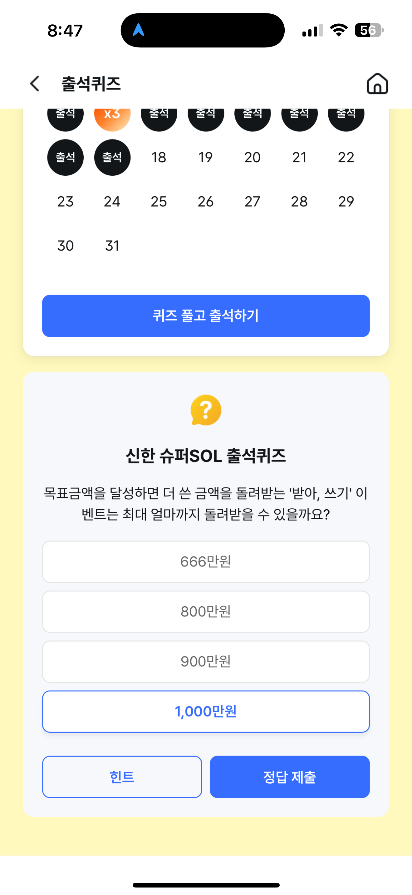 신한 슈퍼SOL 출석퀴즈 정답은 1,000만원 입니다
