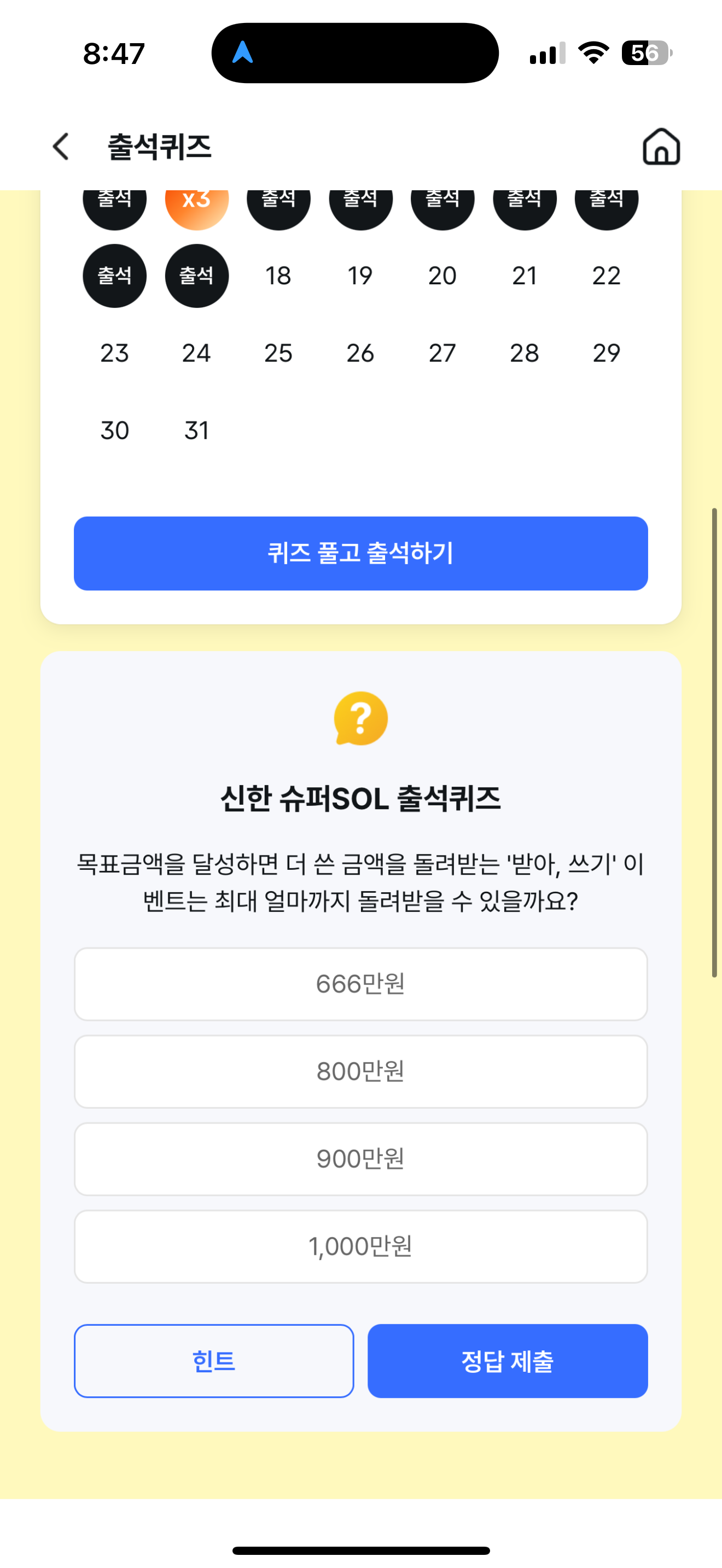 신한 슈퍼SOL 출석퀴즈 정답은 1,000만원 입니다