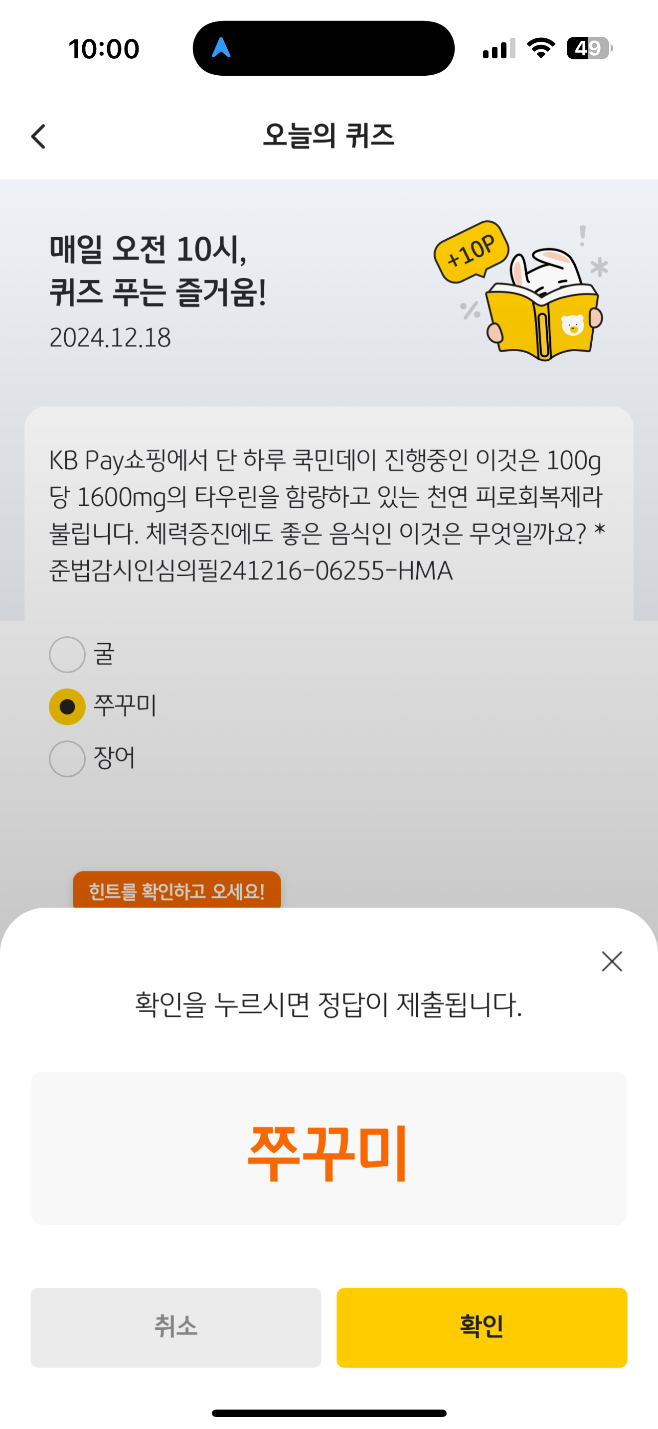 KB pay 오늘의 퀴즈 정답은 쭈꾸미 입니다