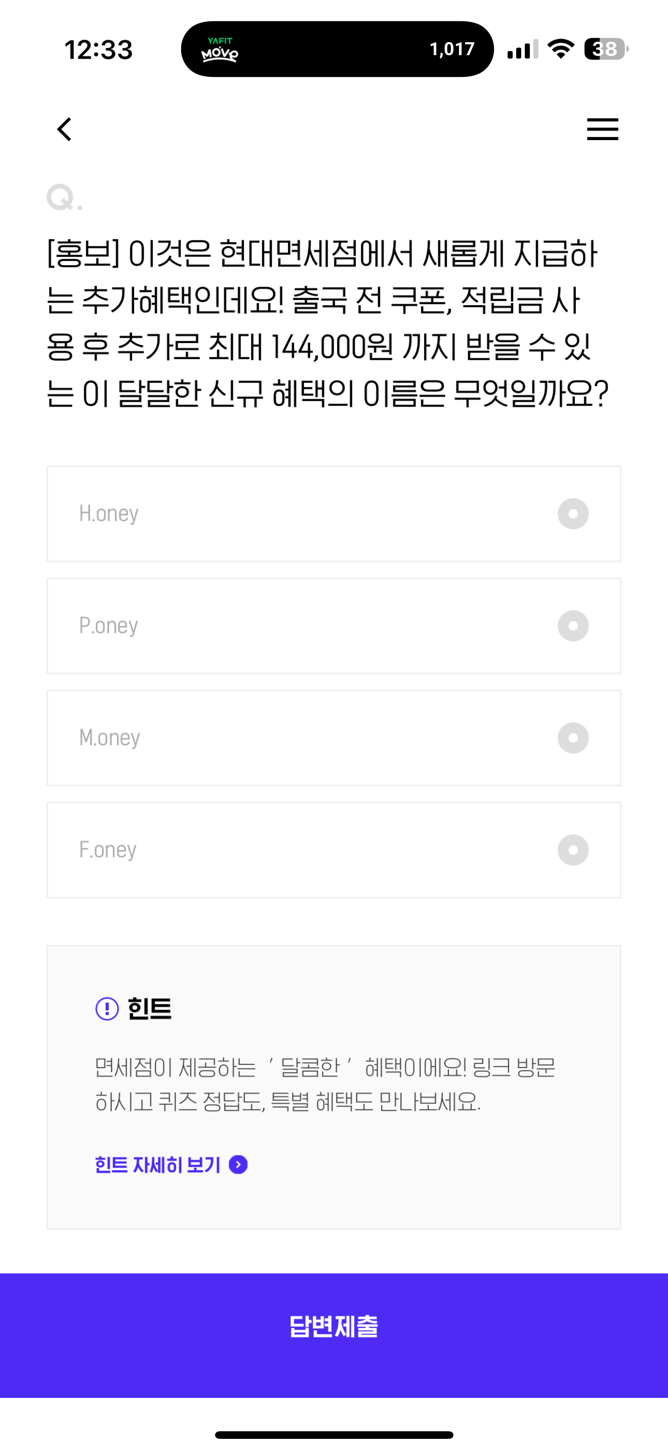 이것은 현대면세점에서 새롭게 지급하는 추가혜택인데요! 출국 전 쿠폰, 적립금 사용 후 추가로 최대 144,000원 까지 받을 수 있는 이 달달한 신규 혜택의 이름은 무엇일까요? 보기는 1. H.oney 2. P.oney 3. M.oney 4. F.oney 입니다. 현대면세점에서 새롭게 지급하는 추가 혜택이라고 하니 해외 나가는 분들은 참고해 두세요