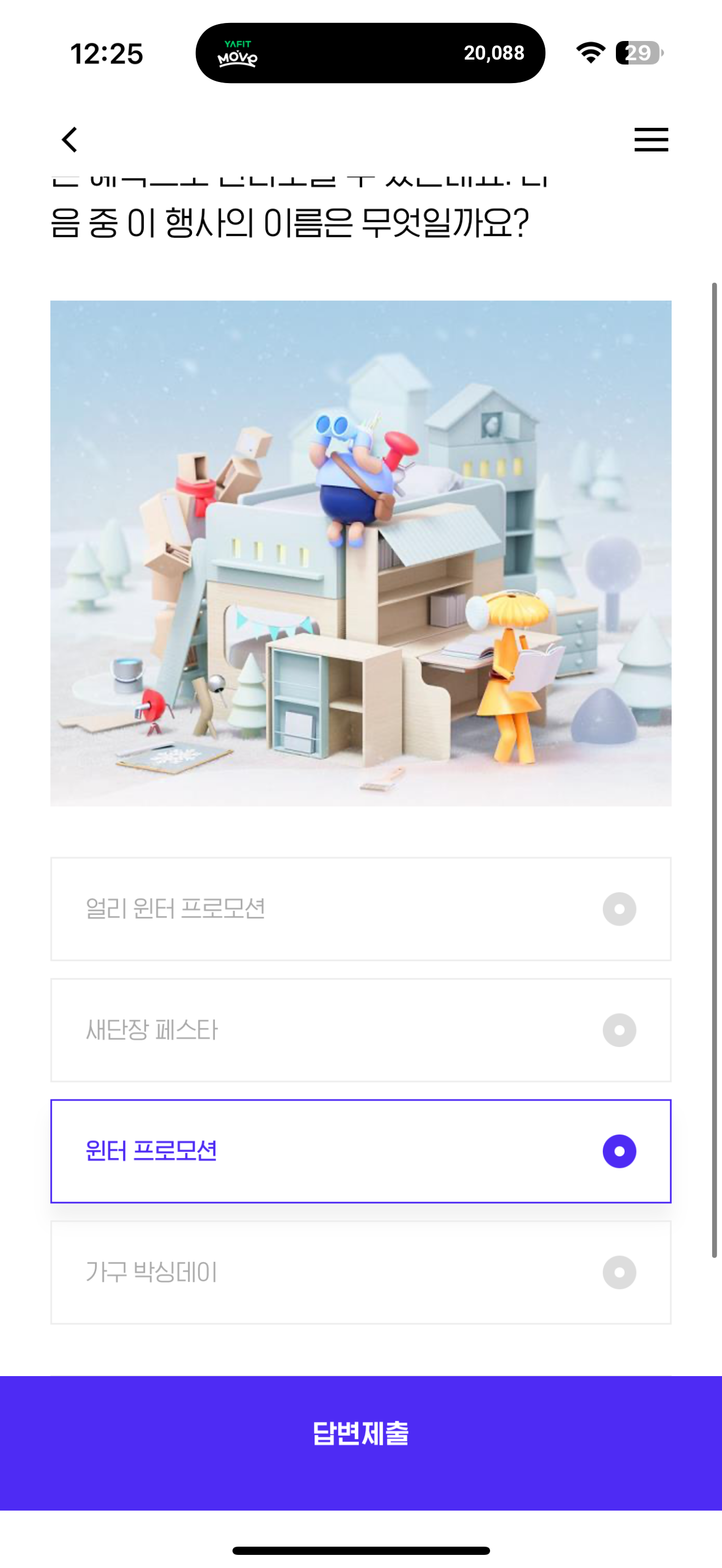 겨울맞이 프로모션 OPEN! 리바트 세계 가구만의 홈 스타일링 제안과 감각적인 가구들을 최대 70% 할인 특가와 13% 장바구니 쿠폰 혜택으로 만나보실 수 있는데요. 다음 중 이 행사의 이름은 무엇일까요? 보기는 1. 얼리 윈터 프로모션 2. 새단장 페스타 3. 윈터 프로모션 4. 가구 박싱데이 입니다