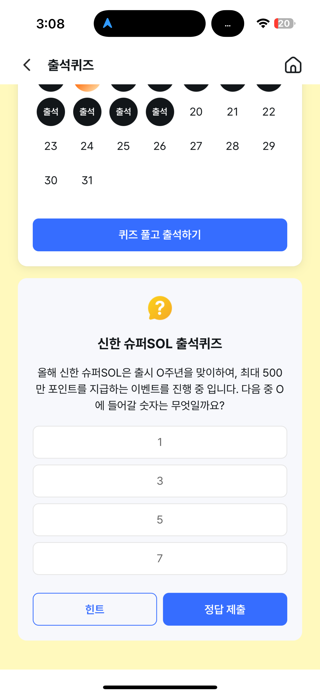 올해 신한 슈퍼SOL은 출시 O주년을 맞이하여, 최대 500만 포인트를 지급하는 이벤트를 진행 중 입니다. 다음 중 O에 들어갈 숫자는 무엇일까요? 보기는 1. 1 2. 3 3. 5 4. 7 입니다. 신한 슈퍼SOL 생긴지 얼마나 되었을까요? 이제는 너무나 익숙해진 이름인데 생긴지가 의외로 오래되지 않았습니다.