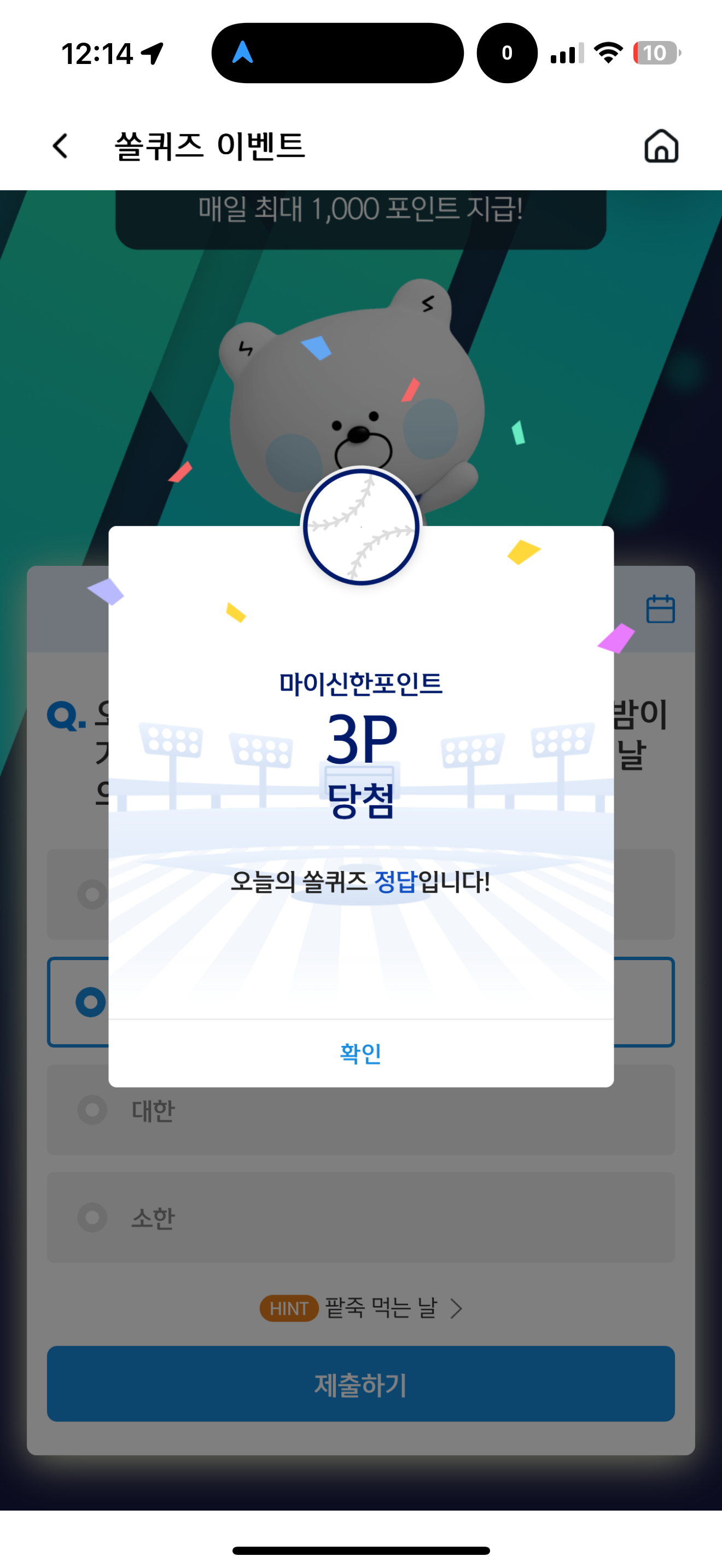 신한 슈퍼SOL 야구/상식 쏠퀴즈 정답은 동지 입니다