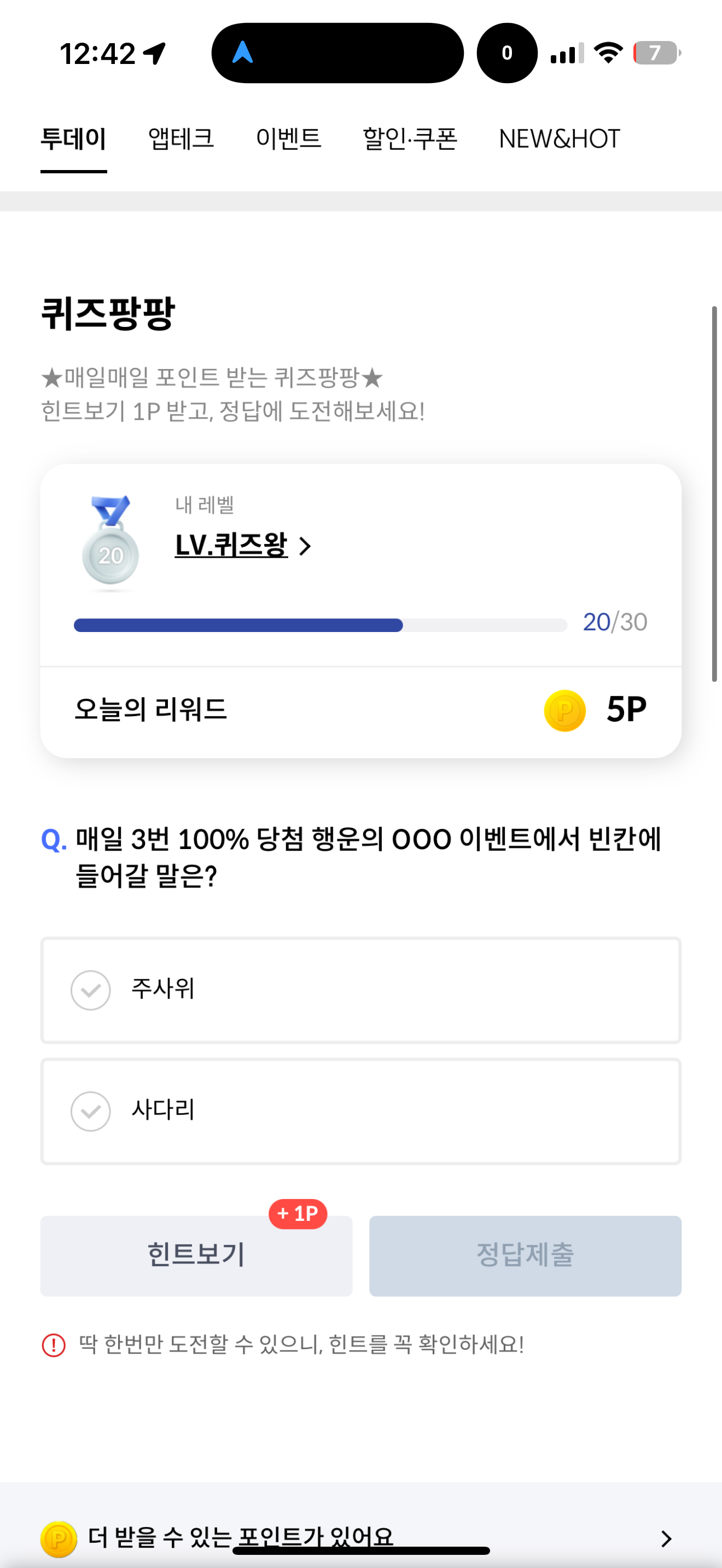 매일 3번 100% 당첨 행운의 OOO 이벤트에서 빈칸에 들어갈 말은? 보기는 1. 주사위 2. 사다리 입니다. 3번 100% 당첨 행운의 기회를 잡을 수 있습니다. 쉽게 이벤트에 참여하고 득템할 수 있으니 잘 참고해서 도전해 보세요