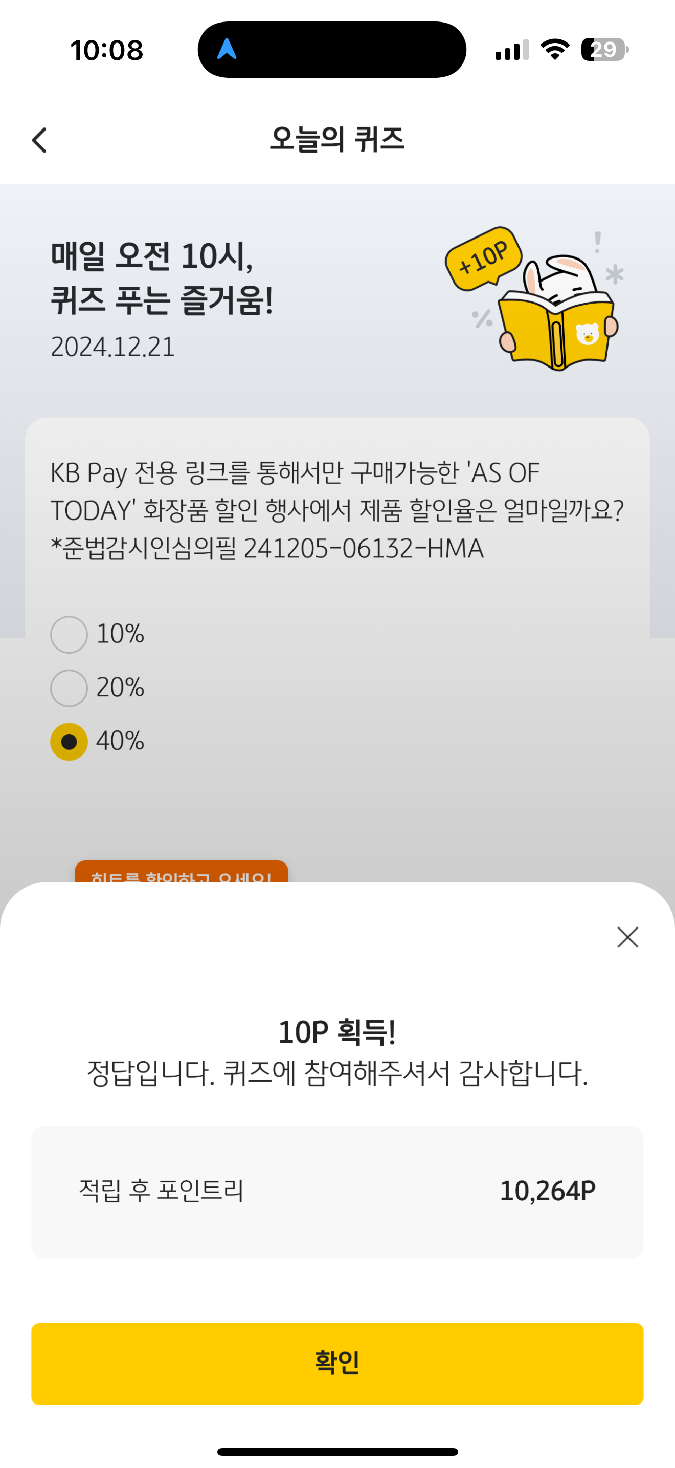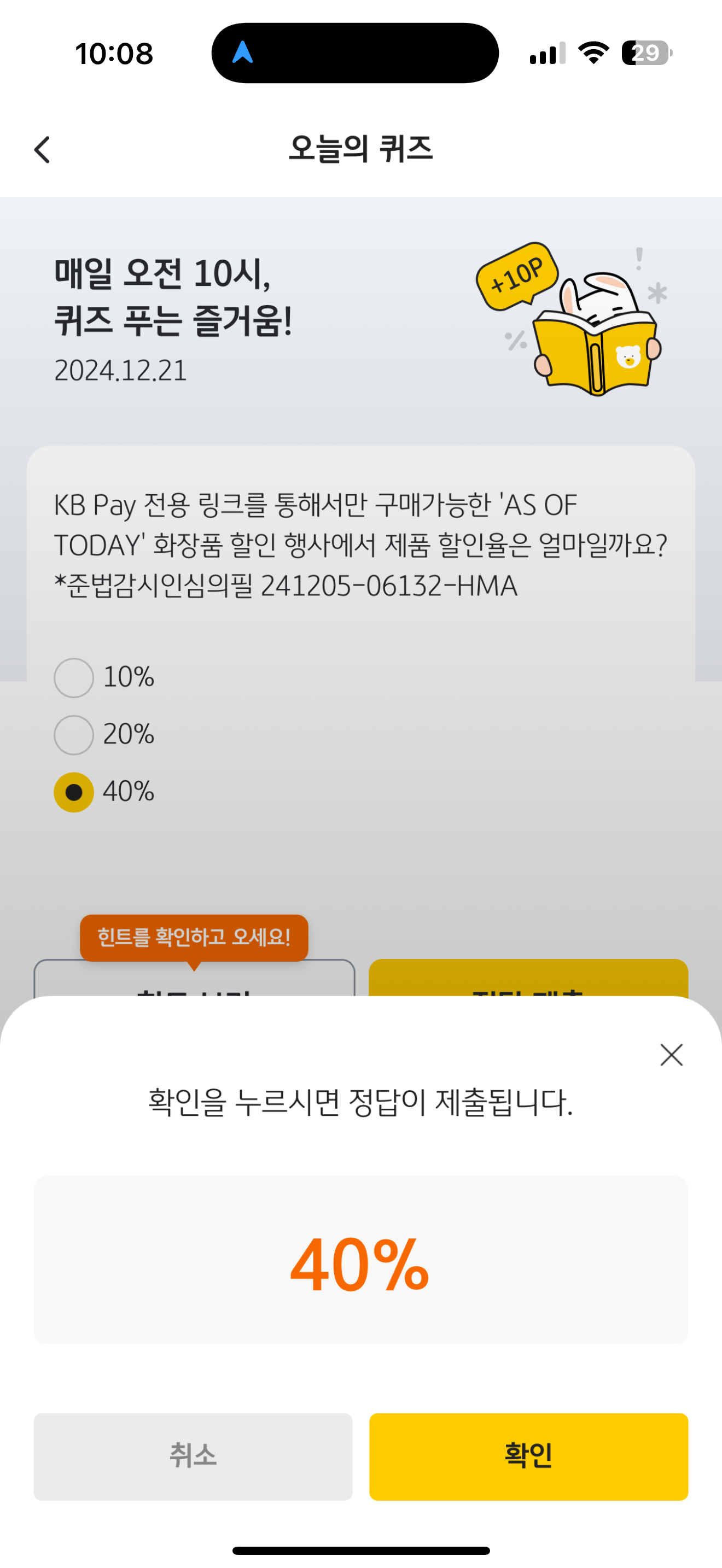 KB Pay 오늘의 퀴즈 정답은 40% 입니다