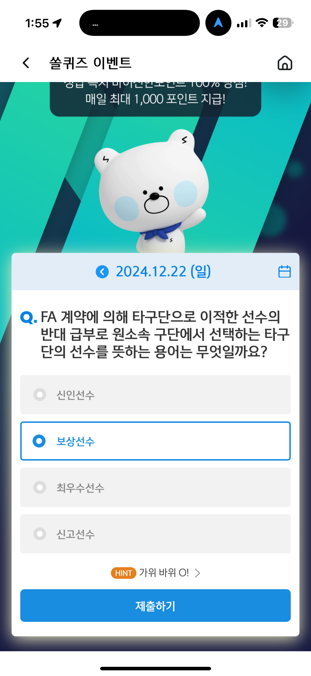 신의 슈퍼SOL 야구/상식 쏠퀴즈 정답은 보상선수 입니다