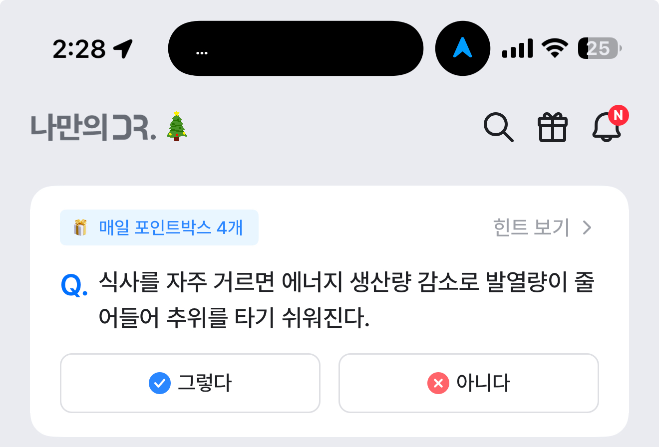 나만의 닥터 퀴즈 12월 22일 정답(식사를 자주 거르면 에너지 생산량 감소로 발열량이 줄어들어 추위를 타기 쉬워진다)