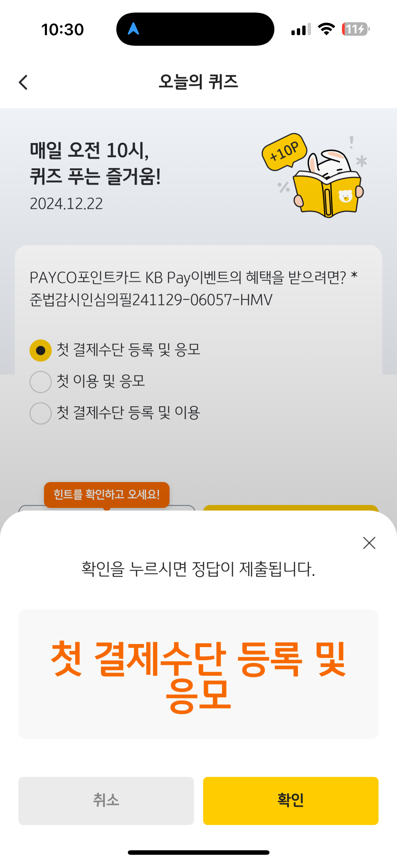 KB Pay 오늘의 퀴즈 정답은 첫 결제수단 등록 및 응모 입니다