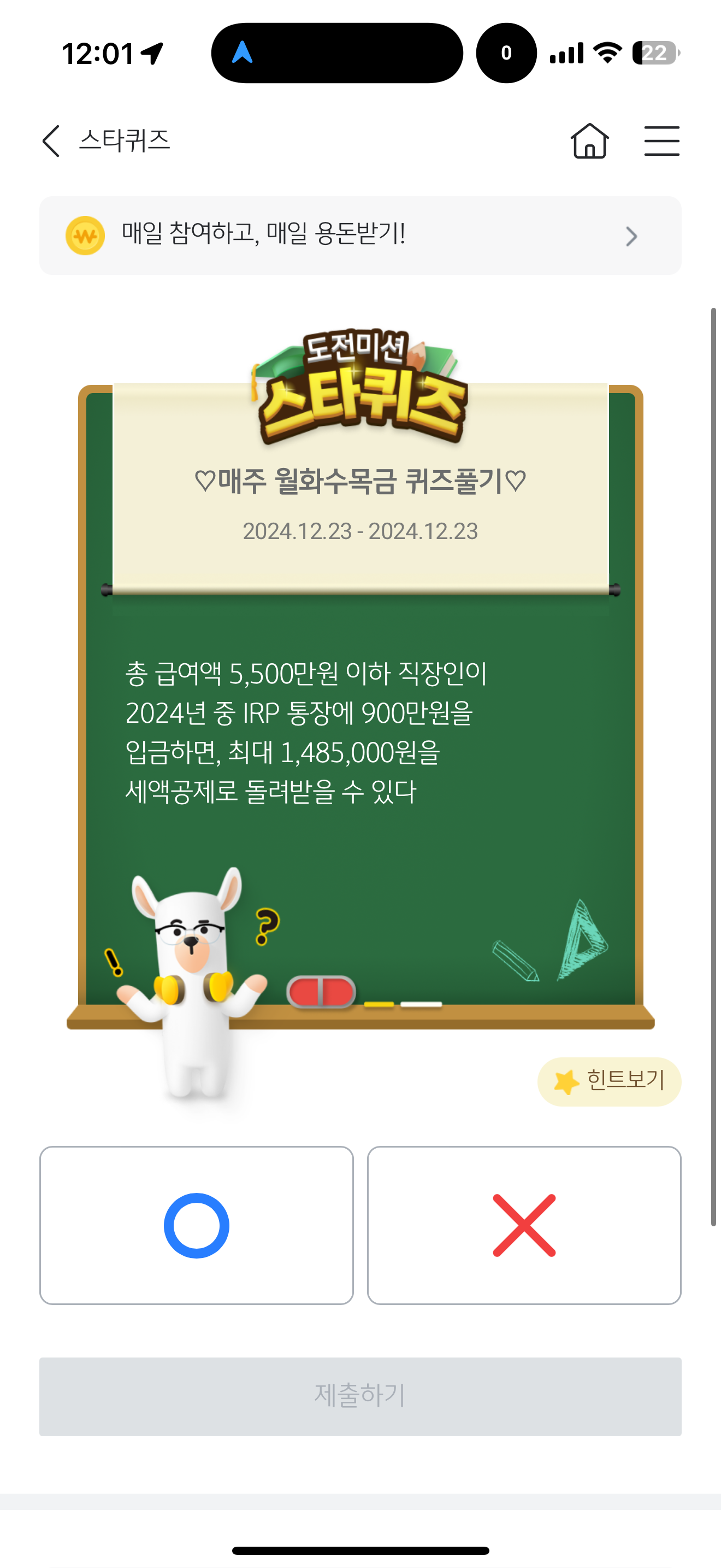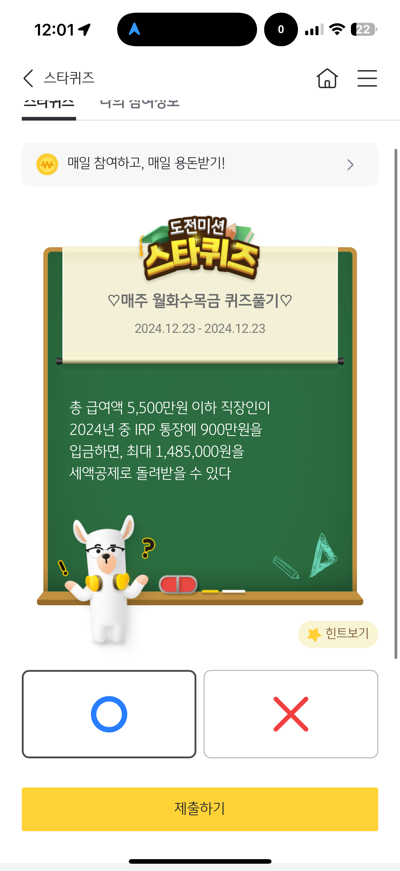 총 급여액 5,500만원 이하 직장인이 2024년 중 IRP 통장에 900만원을 입금하면, 최대 1,485,000원을 세액공제로 돌려받을 수 있다 O, X 퀴즈인데요. 연말에는 세액공제가 굉장히 중요한 시점이죠. IRP 통장에 900만원을 입금하면 세액공제를 얼마나 돌려 받는지 확인하고 해보세요
