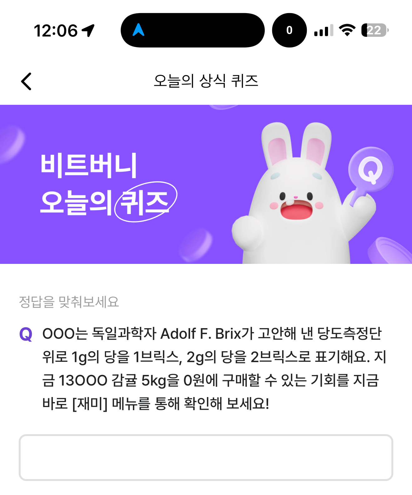 OOO는 독일과학자 Adolf F. Brix가 고안해 낸 당도측정단 위로 1g의 당을 1브릭스, 2g의 당을 2브릭스로 표기해요. 지금 13000 감귤 5kg을 0원에 구매할 수 있는 기회를 지금 바로 [재미] 메뉴를 통해 확인해 보세요! 주관식 퀴즈인데요. 0원에 구매할 수 있는 기회이니 꼭 참고해 두세요