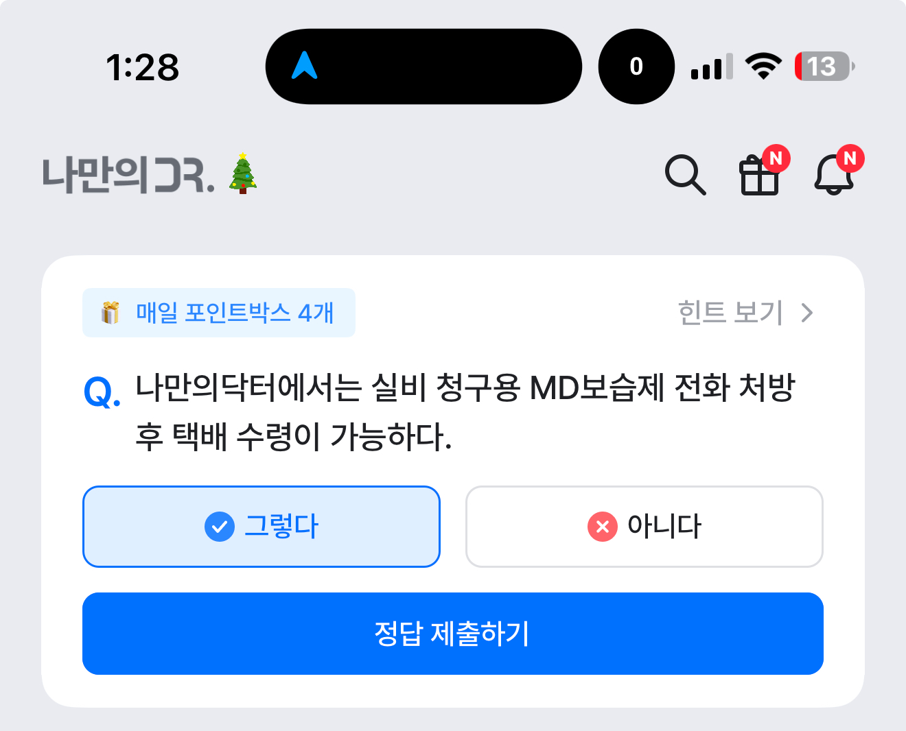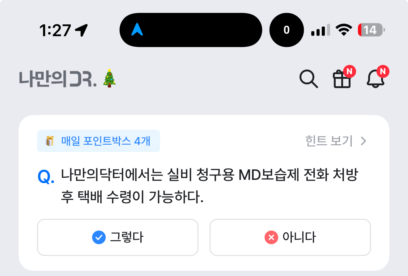나만의 닥터 퀴즈 12월 23일 정답(나만의닥터에서는 실비 청구용 MD보습제 전화 처장후 택배 수령이 가능하다)