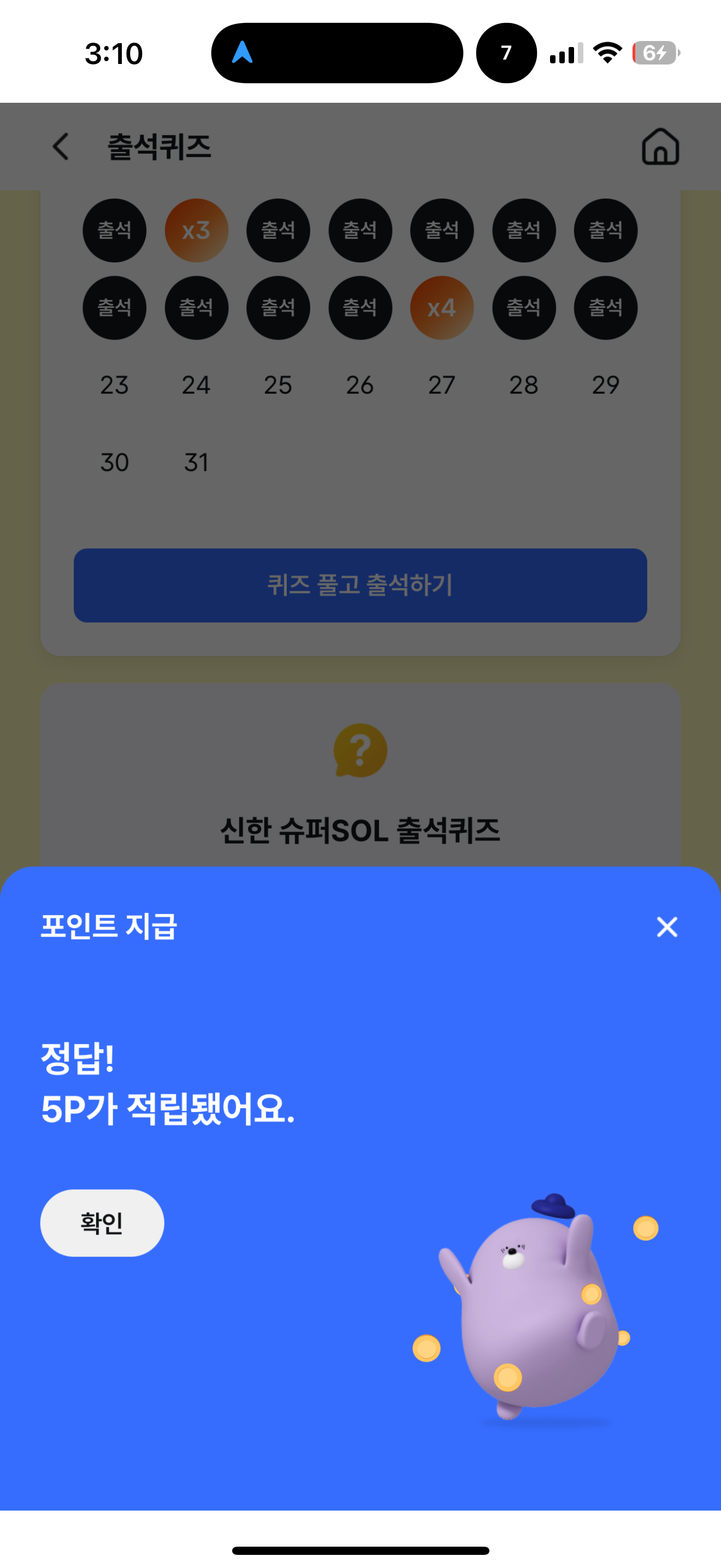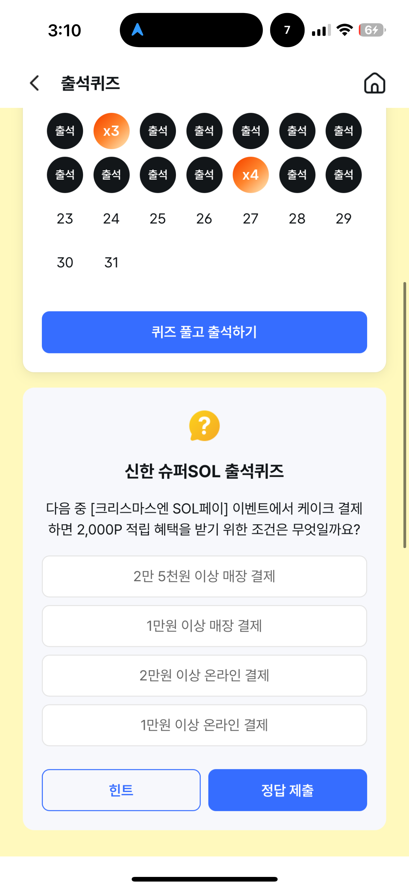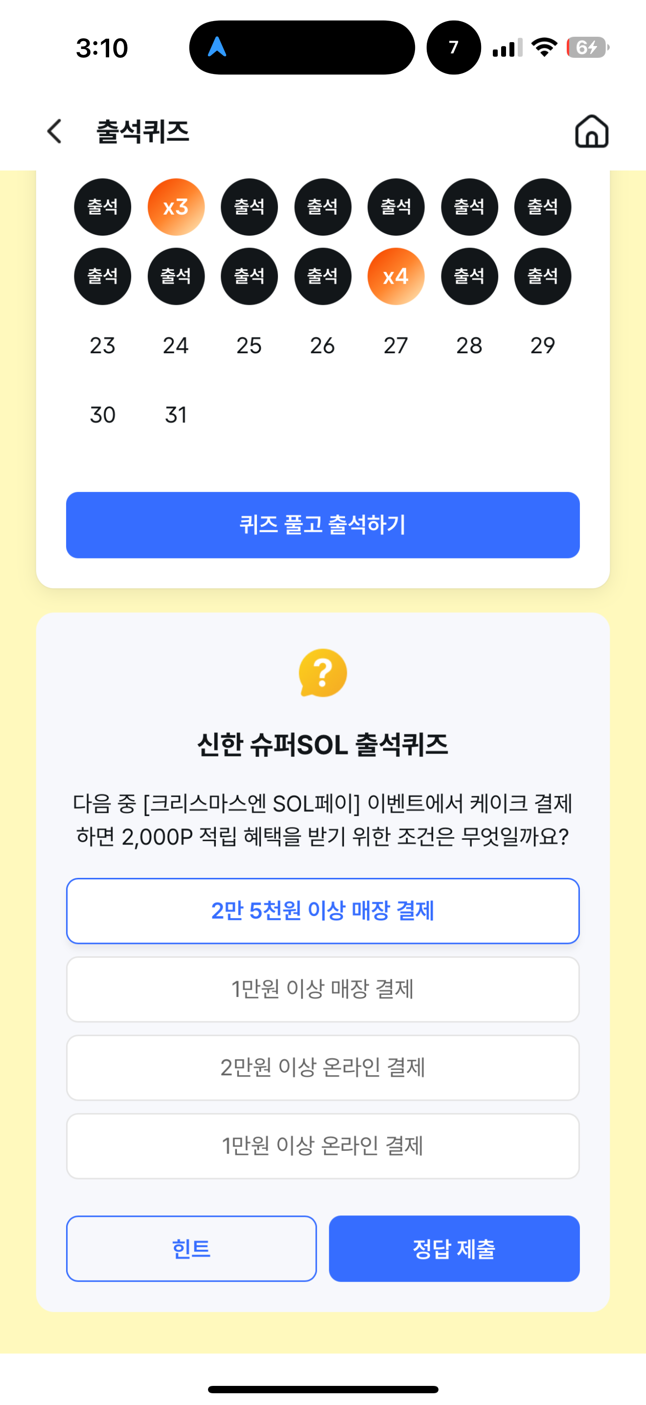 신한 슈퍼SOL 출석퀴즈 정답은 2만 5천원 이상 매장 결제 입니다
