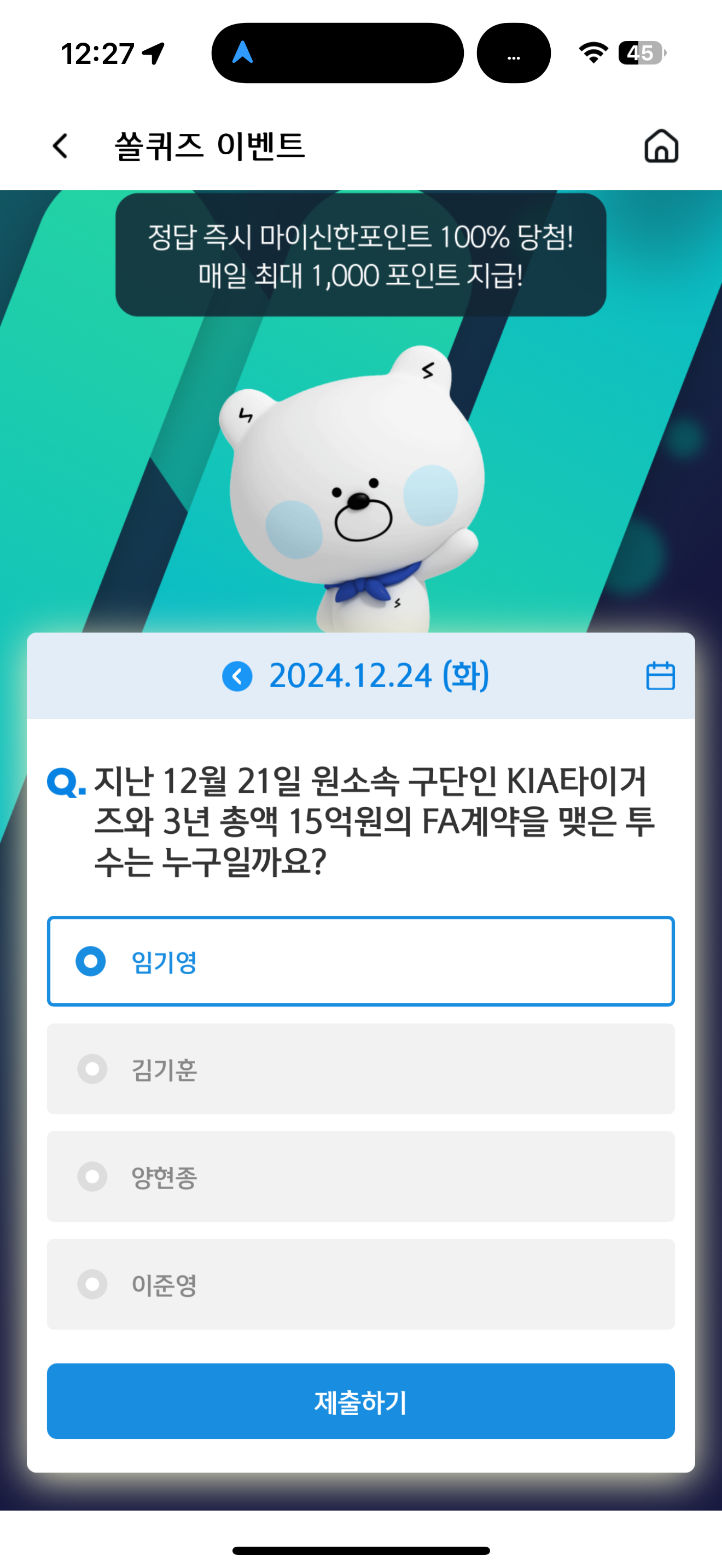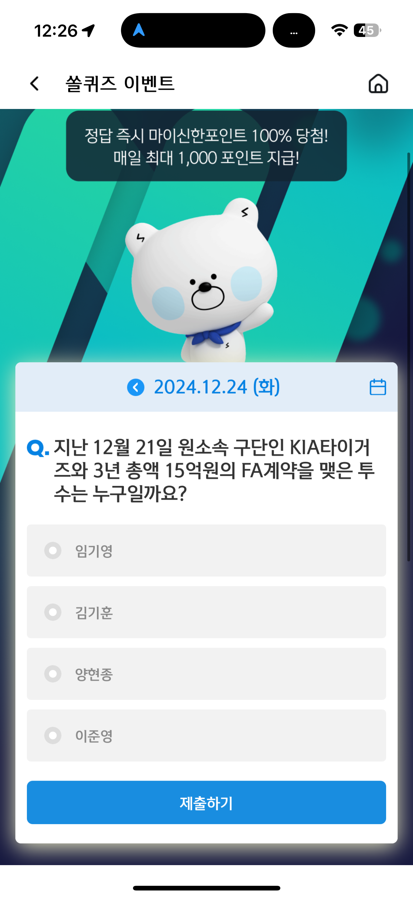 신한 슈퍼SOL 야구/상식 쏠퀴즈 12월 24일 문제입니다