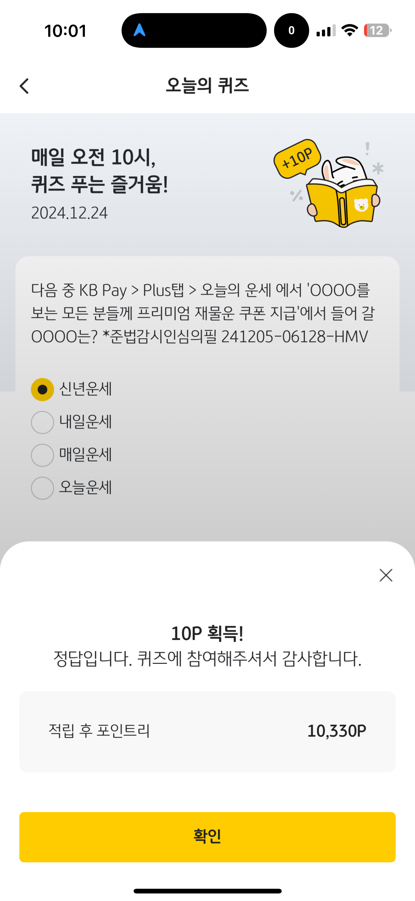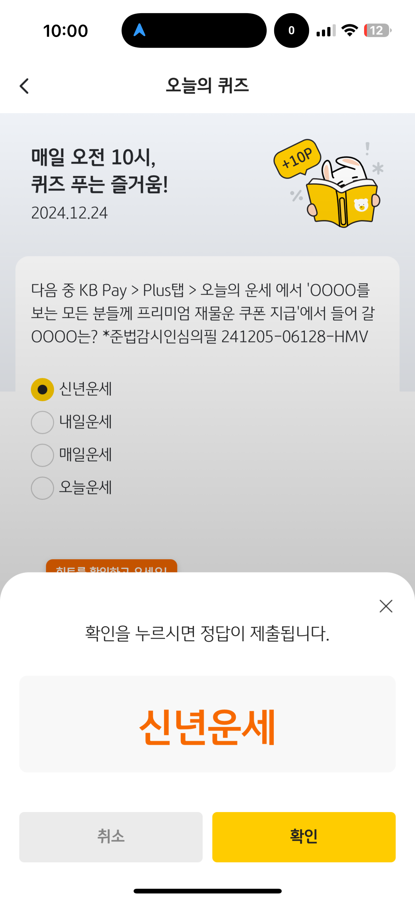 KB Pay 오늘의 퀴즈 정답은 신년운세 입니다