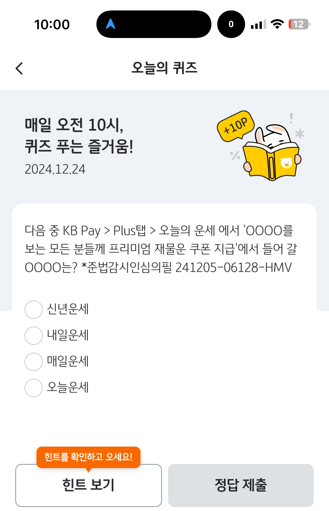 다음 중 KB Pay > Plus탭 > 오늘의 운세 에서 'OOOO를 보는 모든 분들께 프리미엄 재물운 쿠폰 지급'에서 들어 갈 OOOO는? *준법감시인심의필 241205-06128-HMV 보기는 1. 신년운세 2. 내일운세 3. 매일운세 4. 오늘운세 입니다. 이제 올해가 몇일 안남았습니다. 운세를 많이 보게 되는 시점이죠
