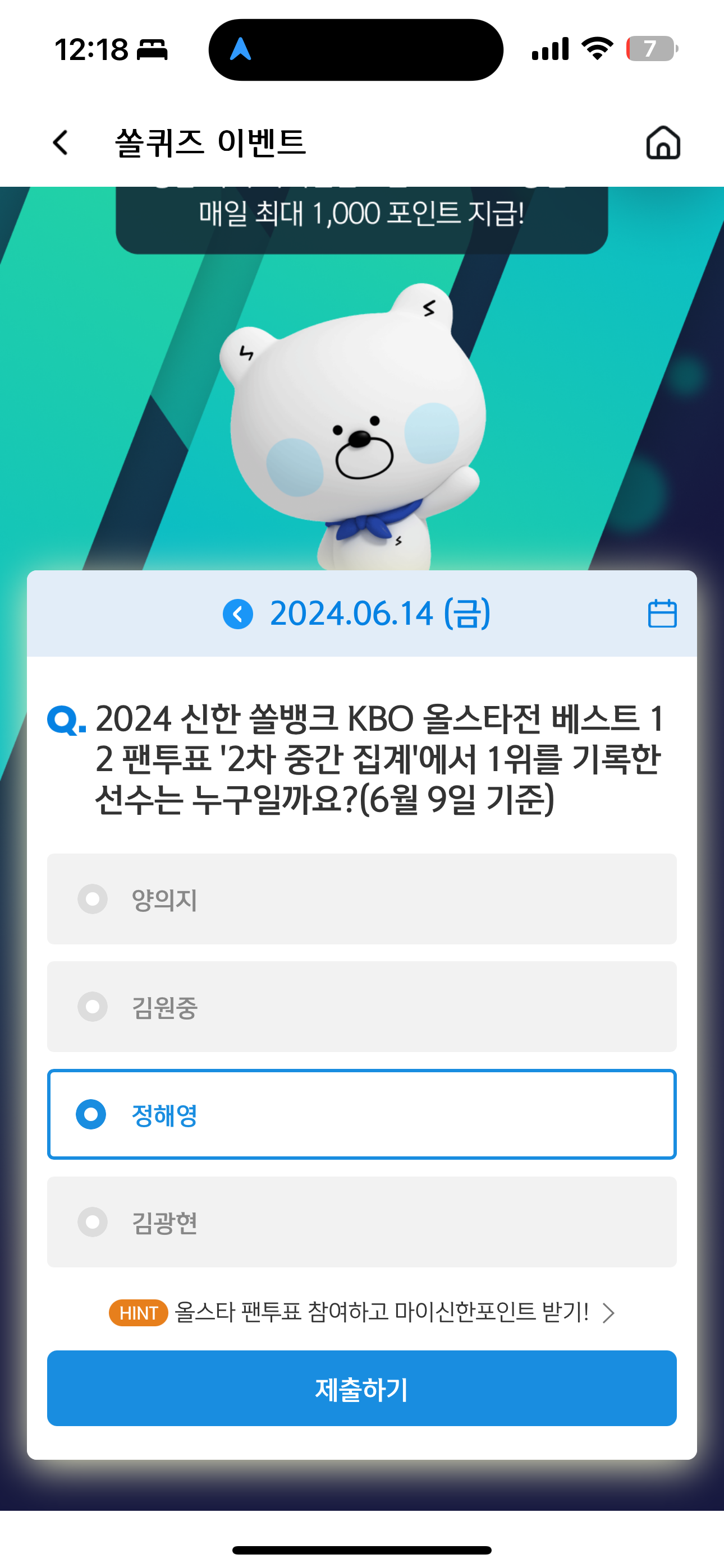 신한 슈퍼SOL 야구/상식 쏠퀴즈 정답은 정혜영 입니다