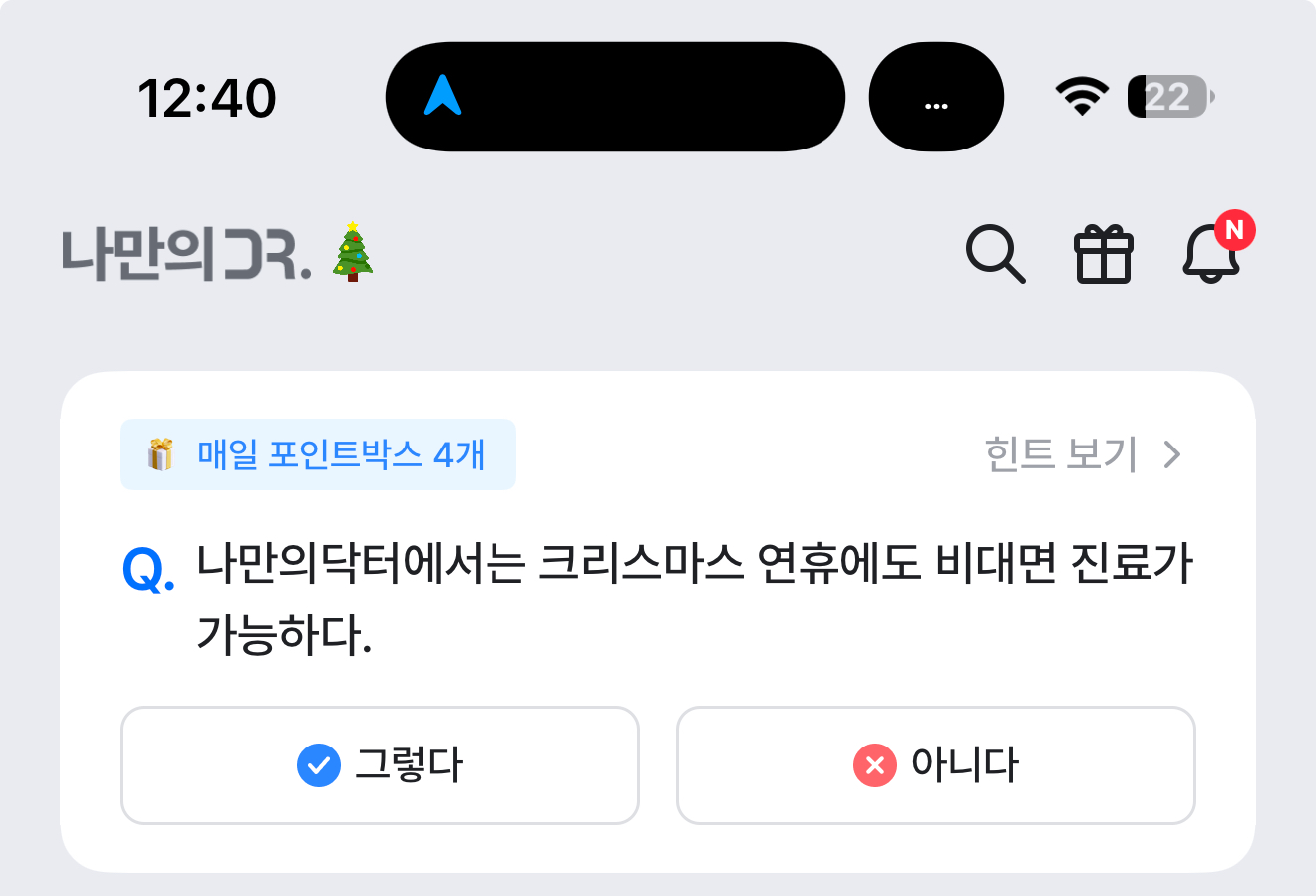 나만의닥터에서는 크리스마스 연휴에도 비대면 진료가 가능하다. 그렇다. 아니다 선택하면 되는데요. 크리스마스 연휴에 아프면 병원에 어떻게 가야 하나 걱정 많으시죠. 나만의닥터는 비대면 진료를 할 수 있는데 과연 크리스마스 연휴에도 비대면 진료를 할까요? 참고해 보세요