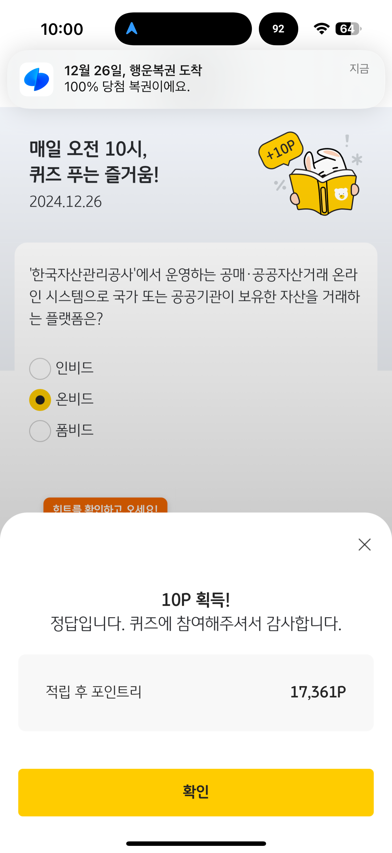 KB Pay 오늘의 퀴즈 정답은 온비드 입니다