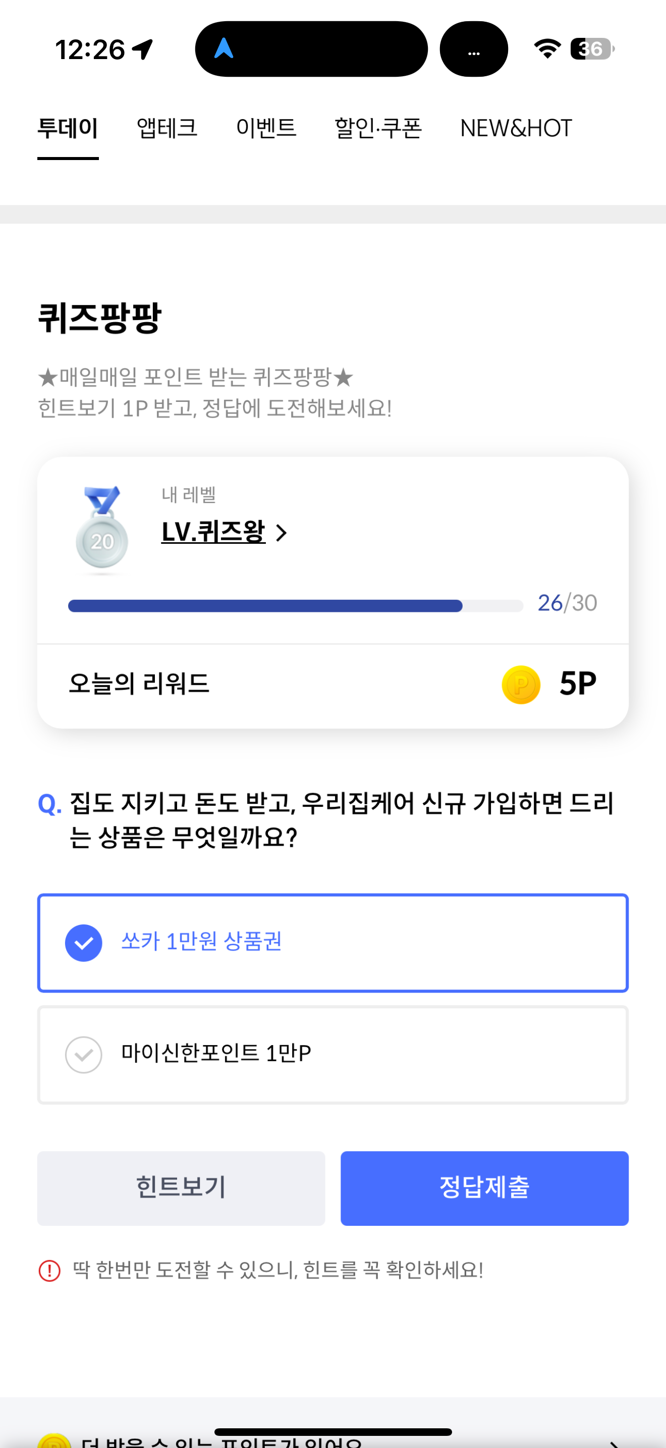 신한카드 퀴즈팡팡 정답은 쏘카 1만원 상품권 입니다