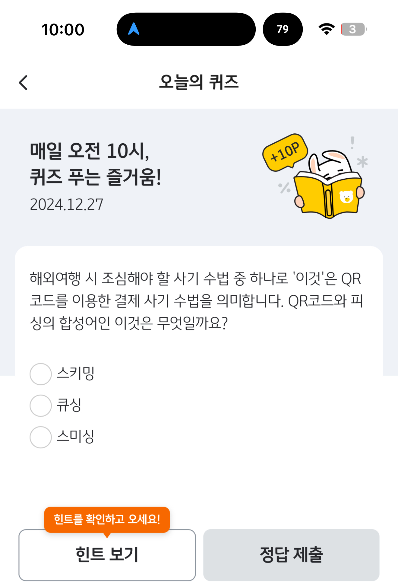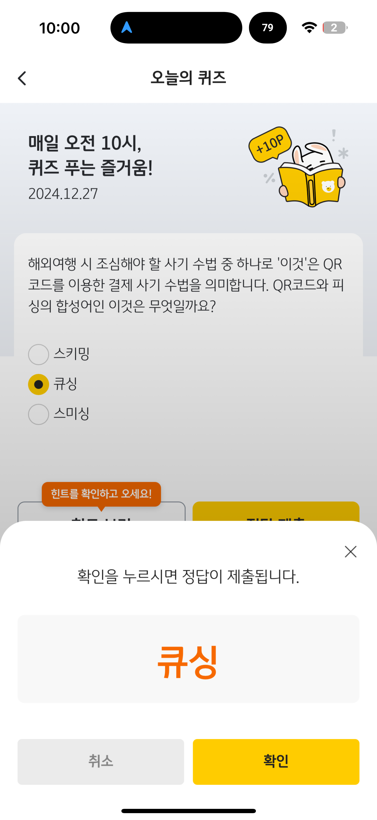KB pay 오늘의 퀴즈 정답은 큐싱 입니다