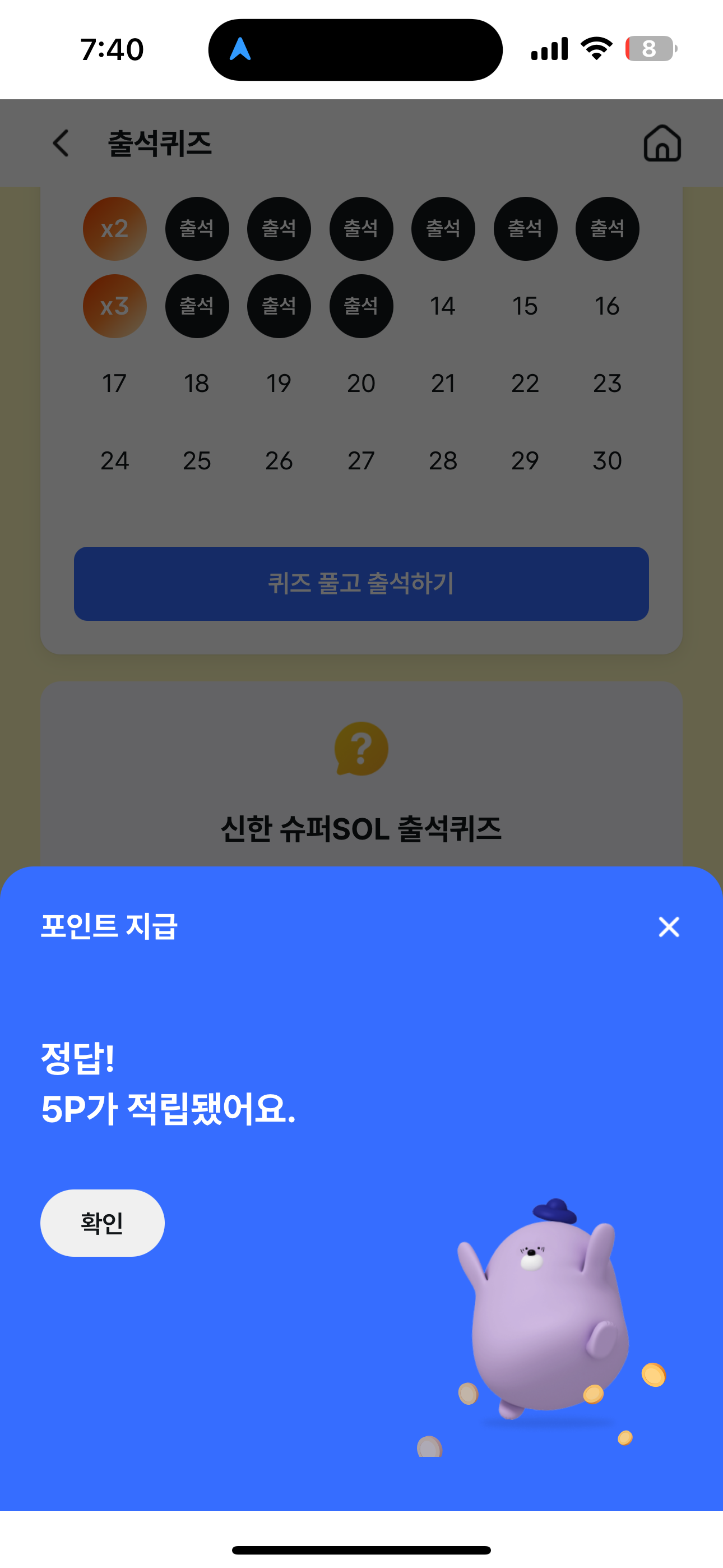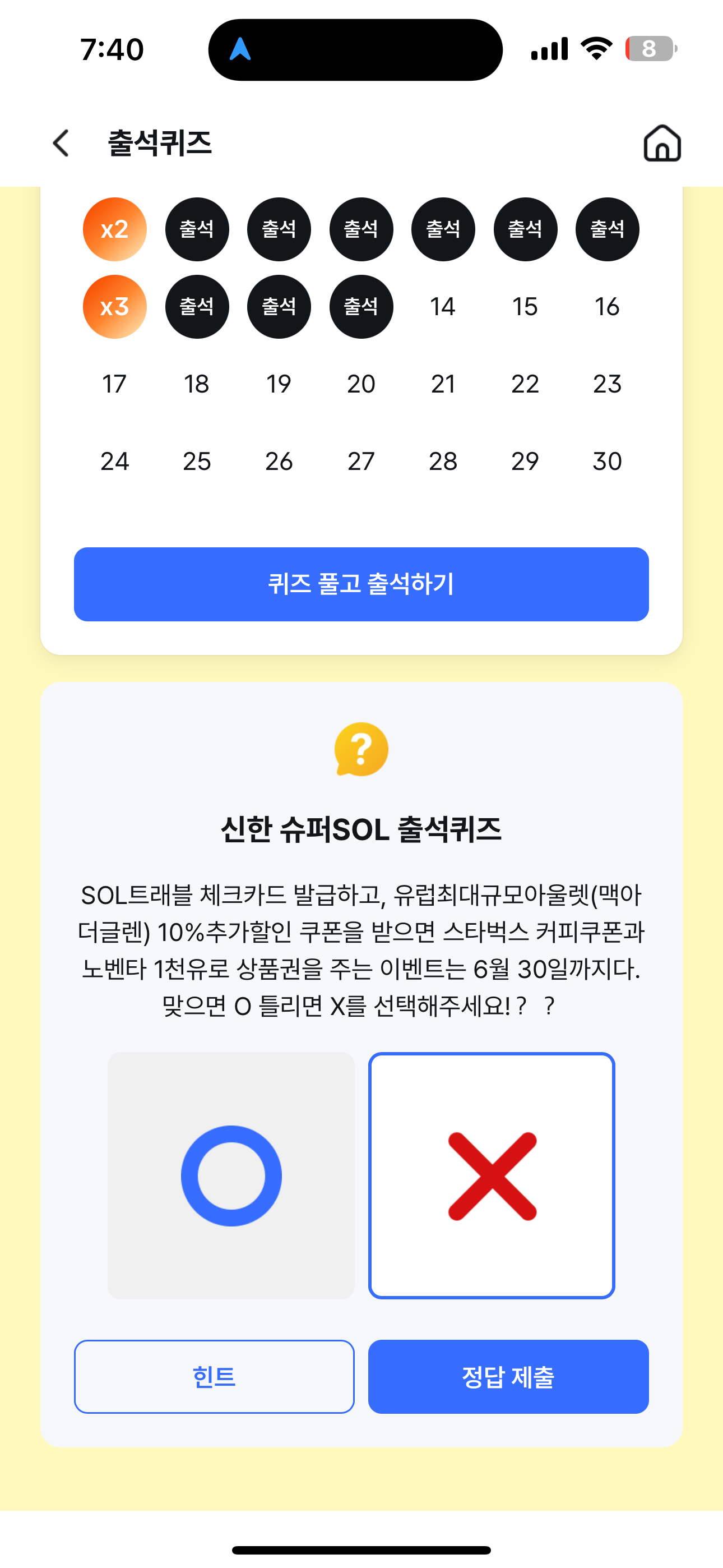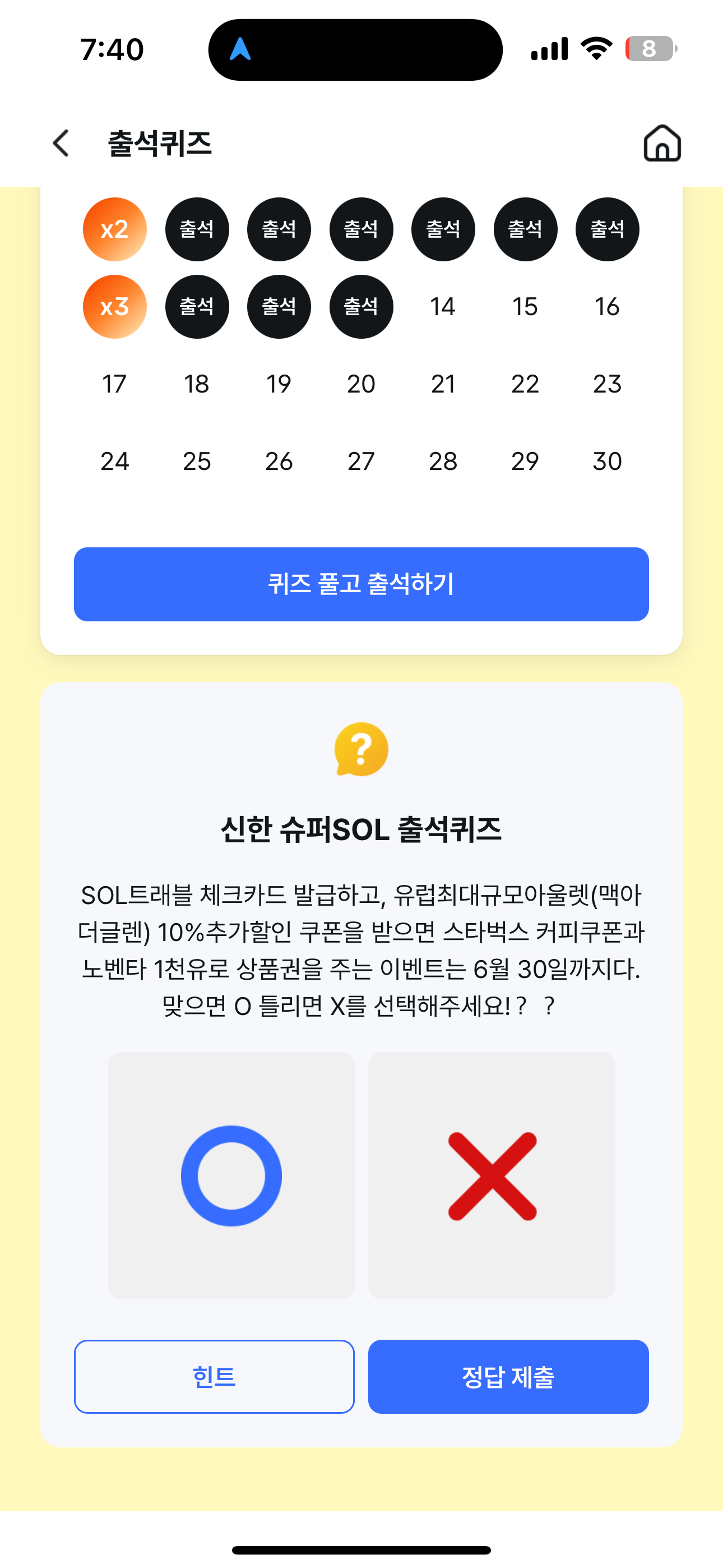 신한 슈퍼SOL 출석퀴즈 정답은 X 입니다