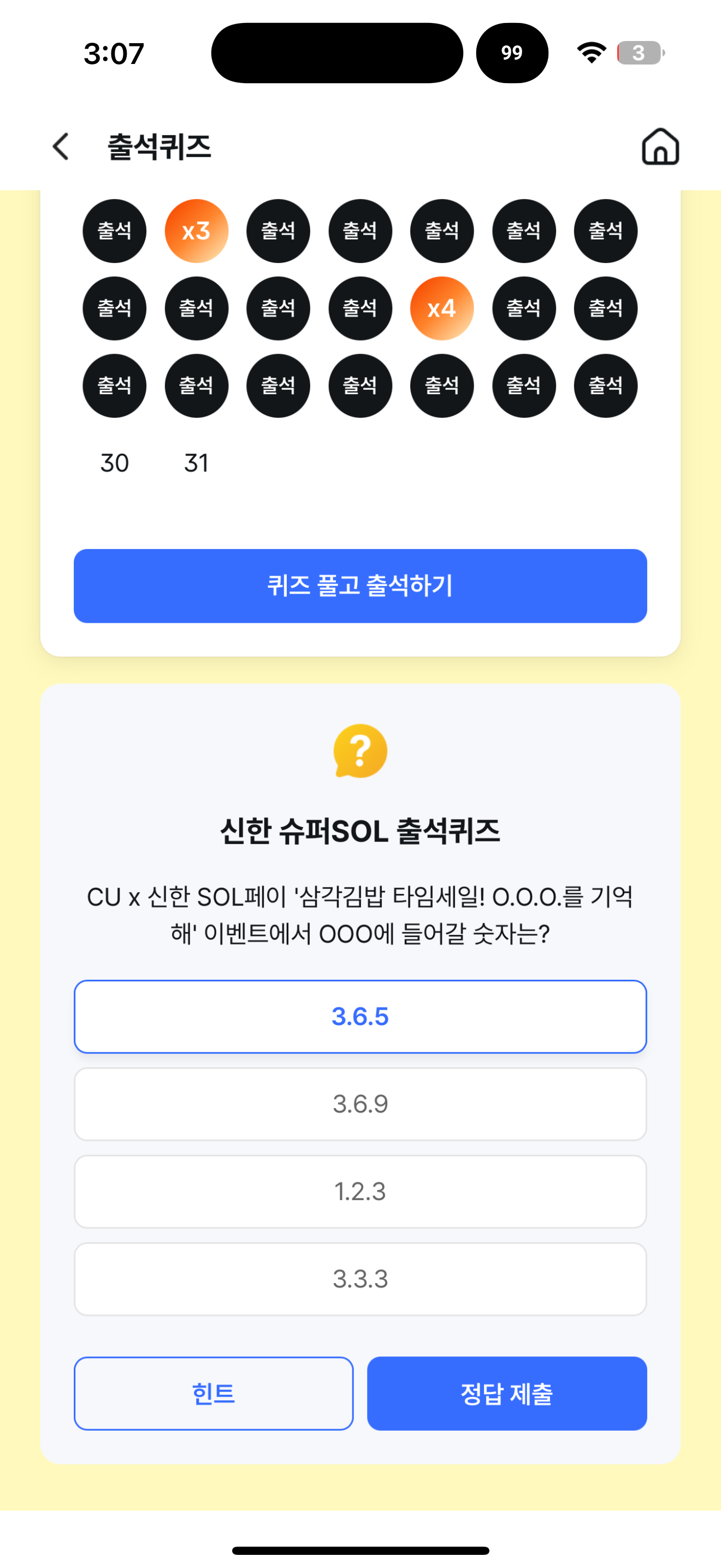 신한 슈퍼SOL 출석퀴즈 정답은 3.6.5 입니다