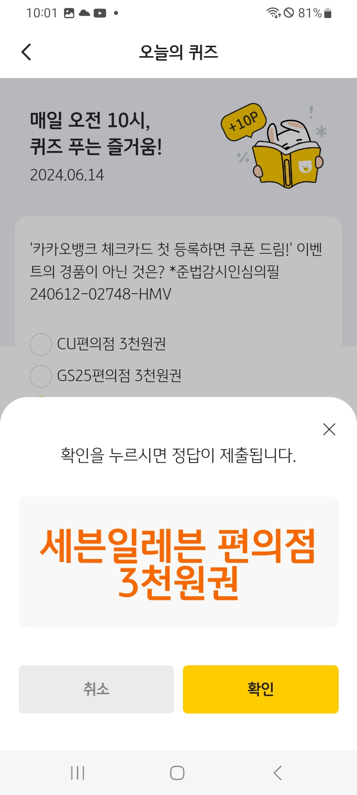KB Pay 오늘의 퀴즈 정답은 세븐일레븐 편의점 3천원권 입니다