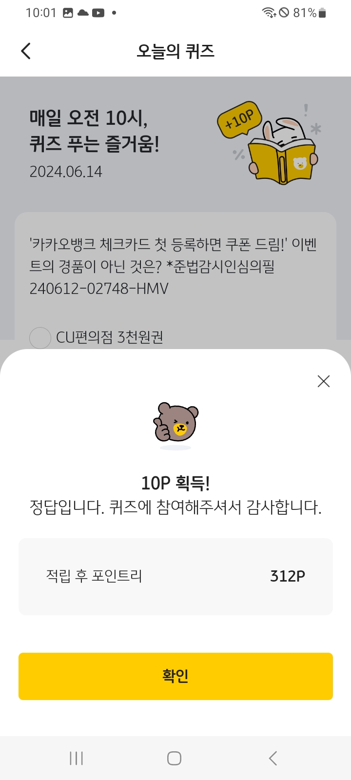 10포인트를 받았습니다. 포인트는 현금 전환 가능하니 꼭 받으시고요. 여러분의 재테크를 응원합니다
