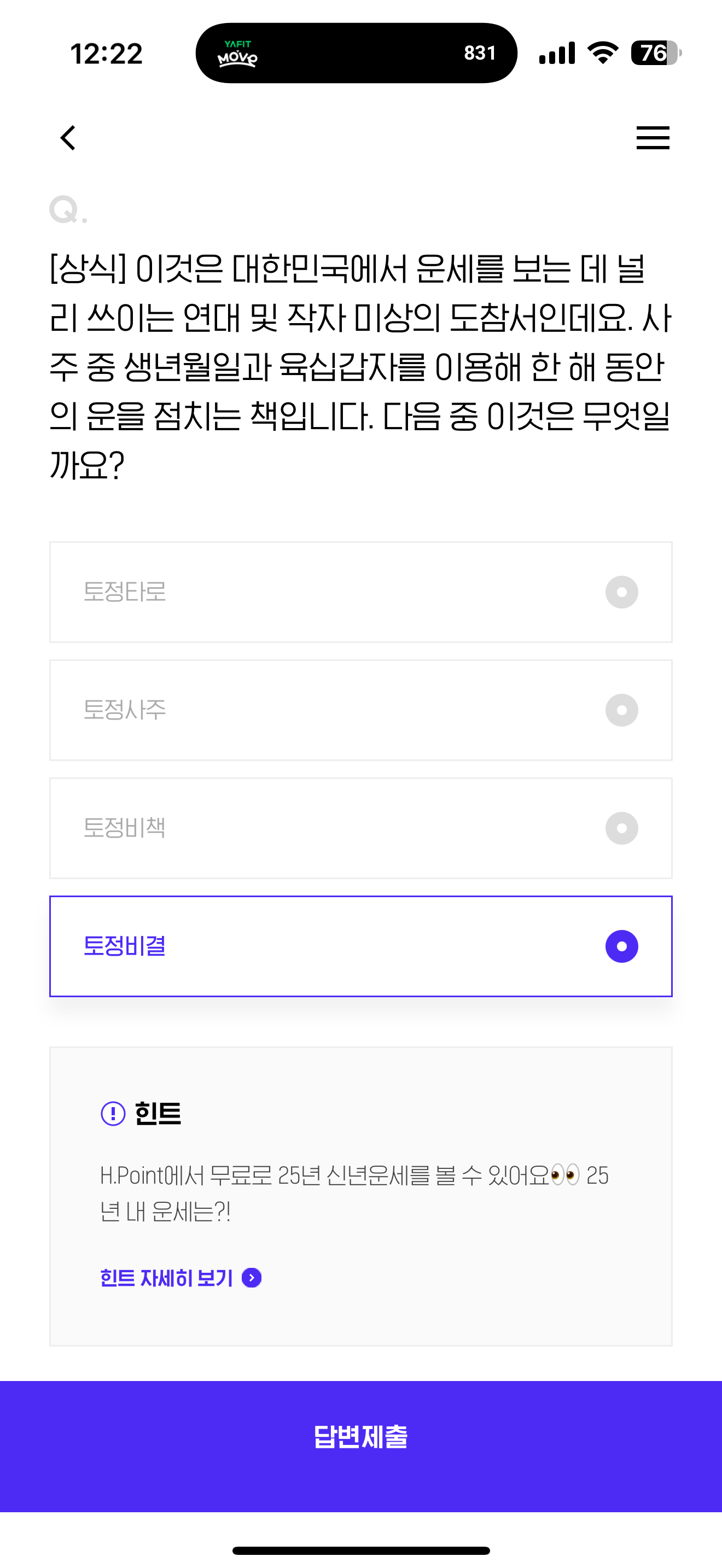 이것은 대한민국에서 운세를 보는 데 널리 쓰이는 연대 및 작자 미상의 도참서인데요. 사주 중 생년월일과 육십갑자를 이용해 한 해 동안의 운을 점치는 책입니다 보기는 1. 토정타로 2. 토정사주 3. 토정비책 4. 토정비결 입니다. H포인트에서는 무료로 신년운세를 볼 수 있으니 참고해서 활용해 보세요