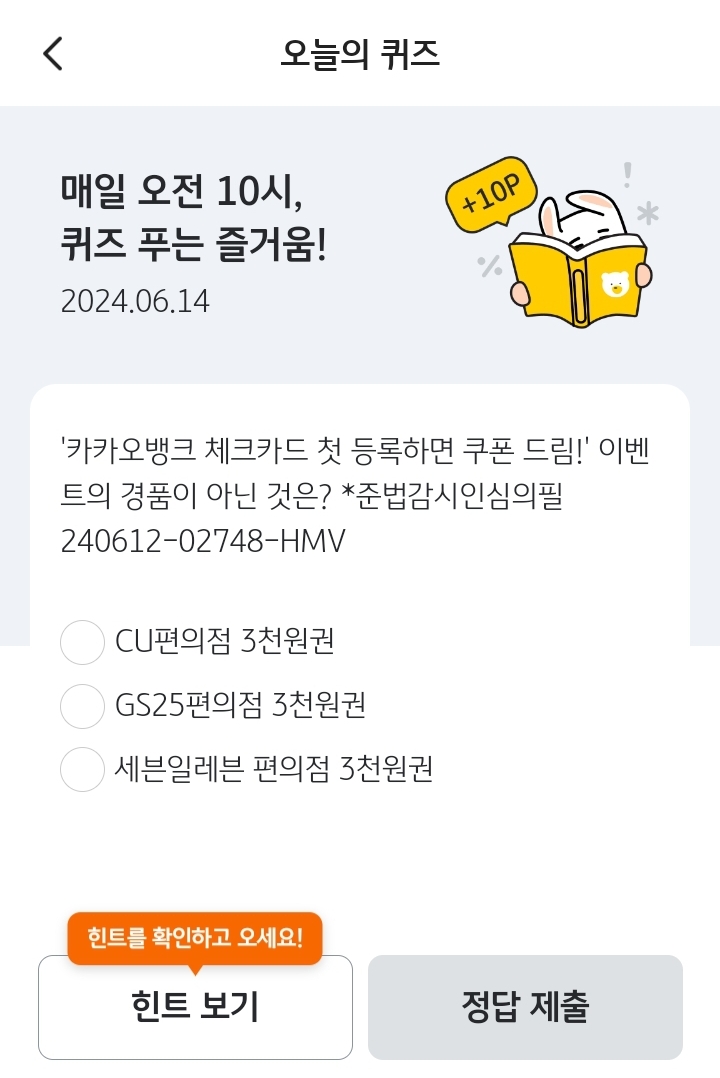 '카카오뱅크 체크카드 첫 등록하면 쿠폰 드림!' 이벤트의 경품이 아닌 것은? *준법감시인심의필 240612-02748-HMV 보기는 1. CU편의점 3천원권 2. GS25편의점 3천원권 3. 세븐일레븐 편의점 3천원권 입니다. 카카오뱅크 체크카드를 KB Pay에 등록할 수 있으니 확인해 보세요