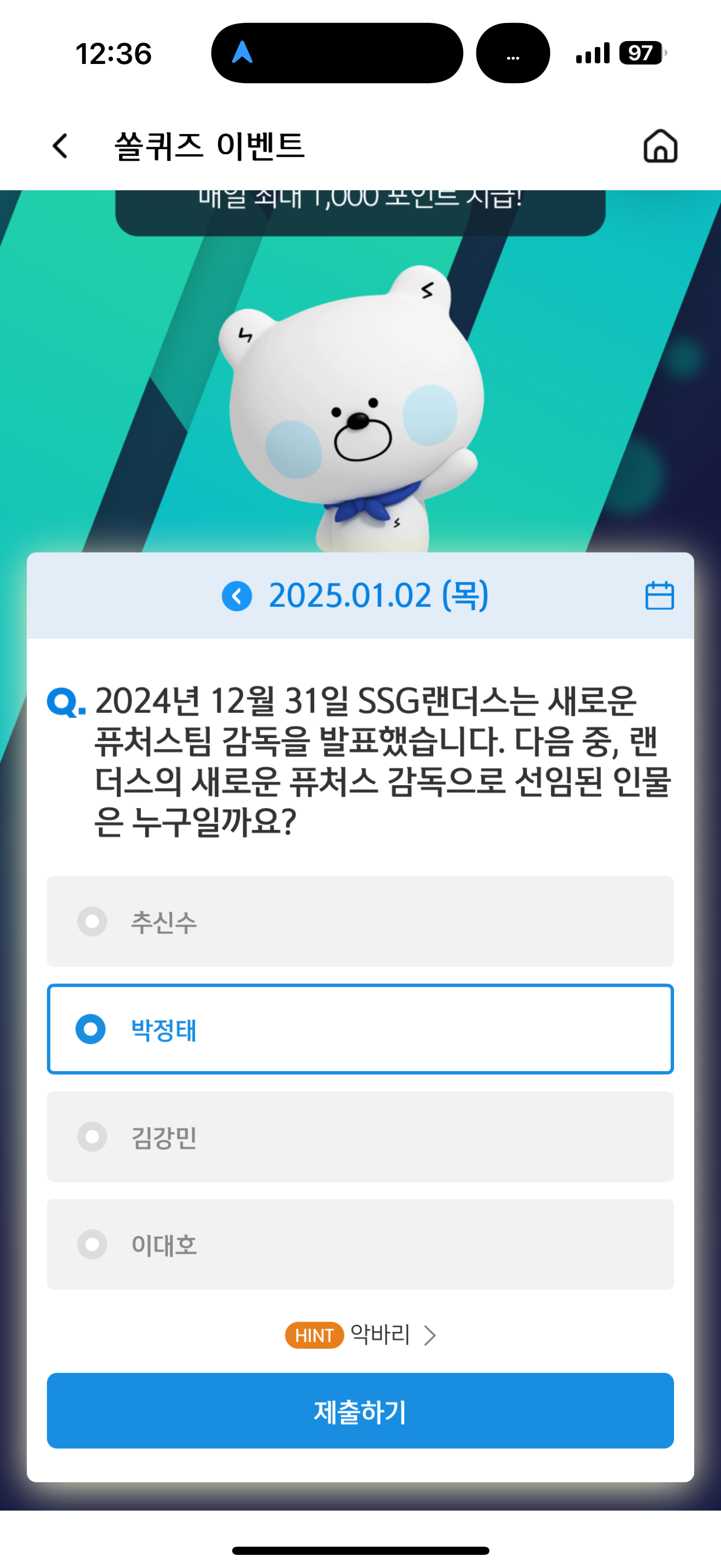 신한 슈퍼SOL 야구/상식 쏠퀴즈 1월 2일 문제입니다