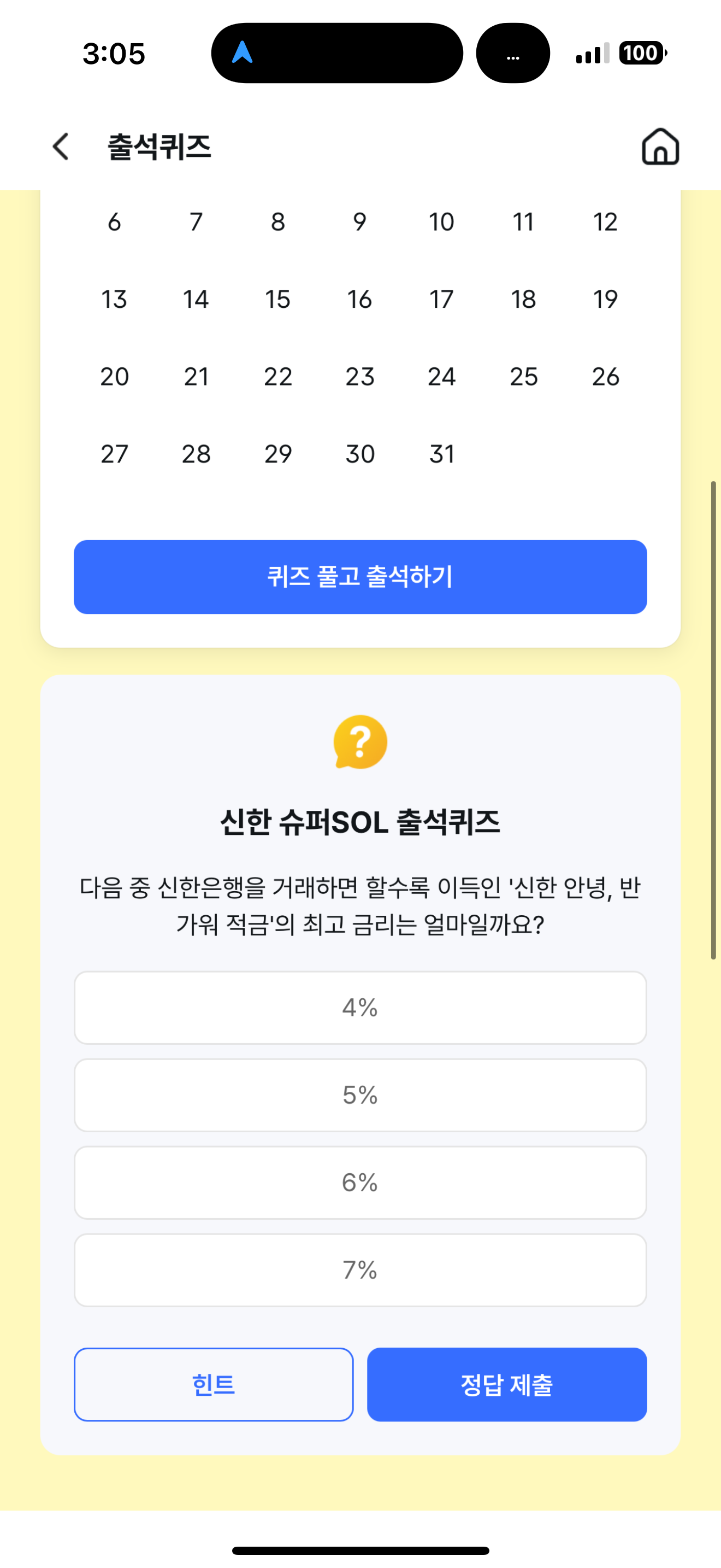 신한 슈퍼SOL 출석퀴즈 정답은 5% 입니다