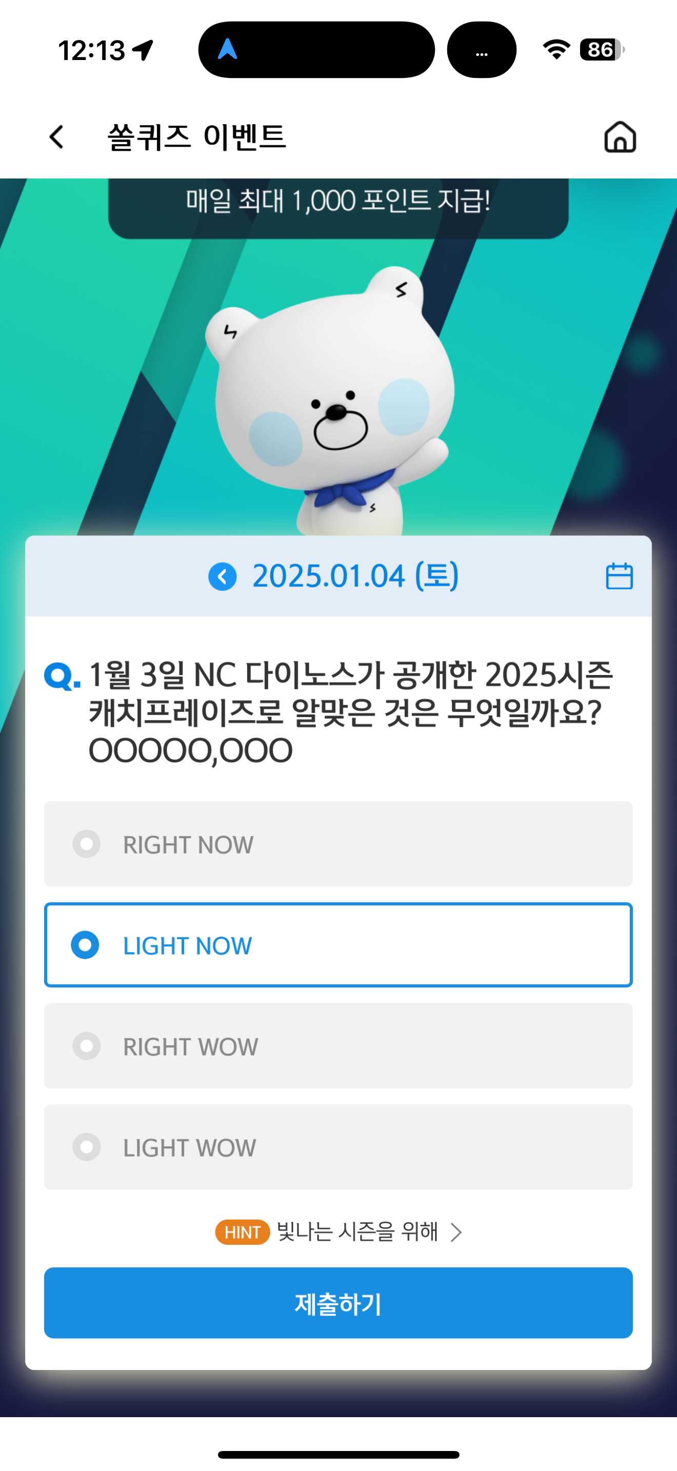 1월 3일 NC 다이노스가 공개한 2025시즌 캐치프레이즈로 알맞은 것은 무엇일까요? OOOOO,OOO 보기는 1. RIGHT NOW 2. LIGHT NOW 3. RIGHT WOW 4. LIGHT WOW 입니다. NC 다이노스가 다시 한번 도약을 위해 새로운 캐치프레이즈를 던졌습니다.