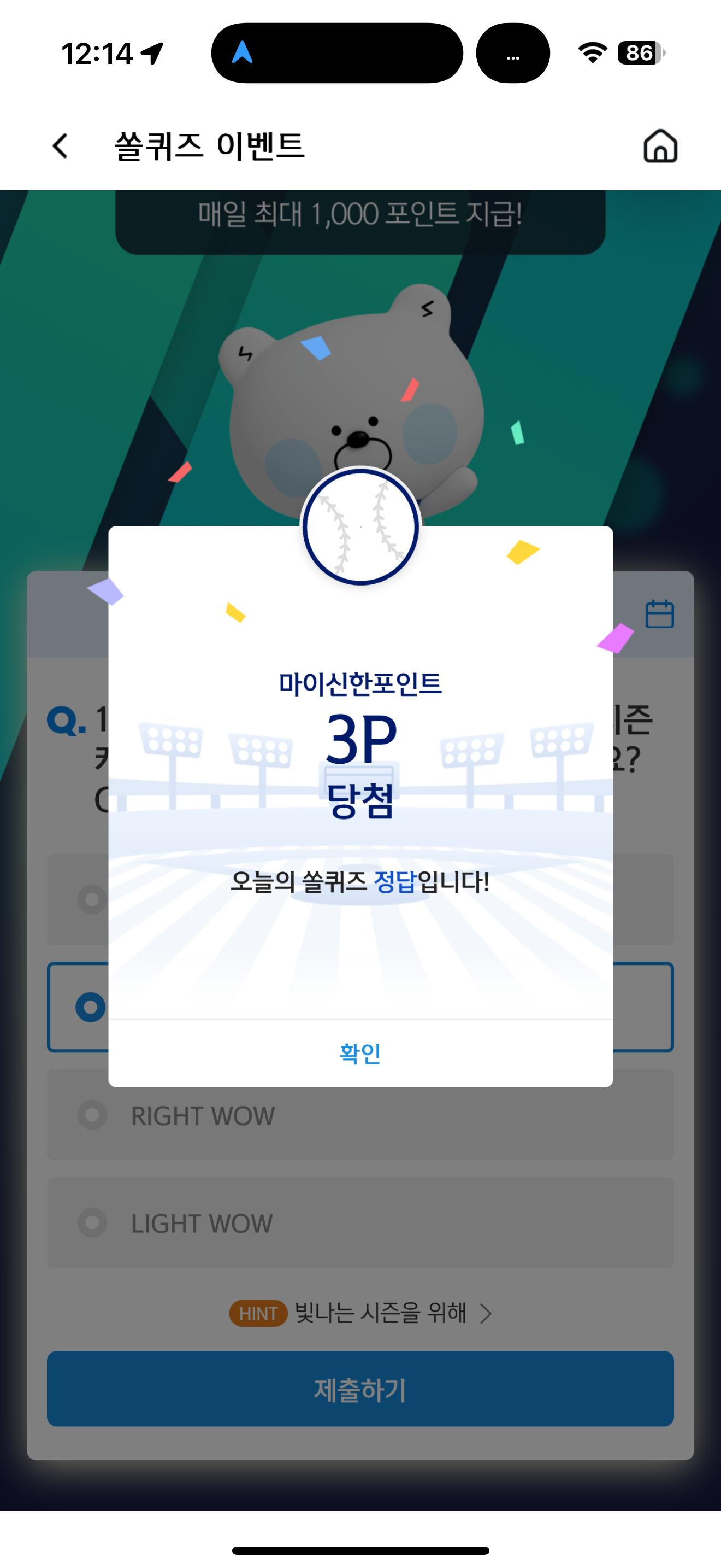 신한 슈퍼SOL 야구/상식 쏠퀴즈 정답은 LIGHT NOW 입니다