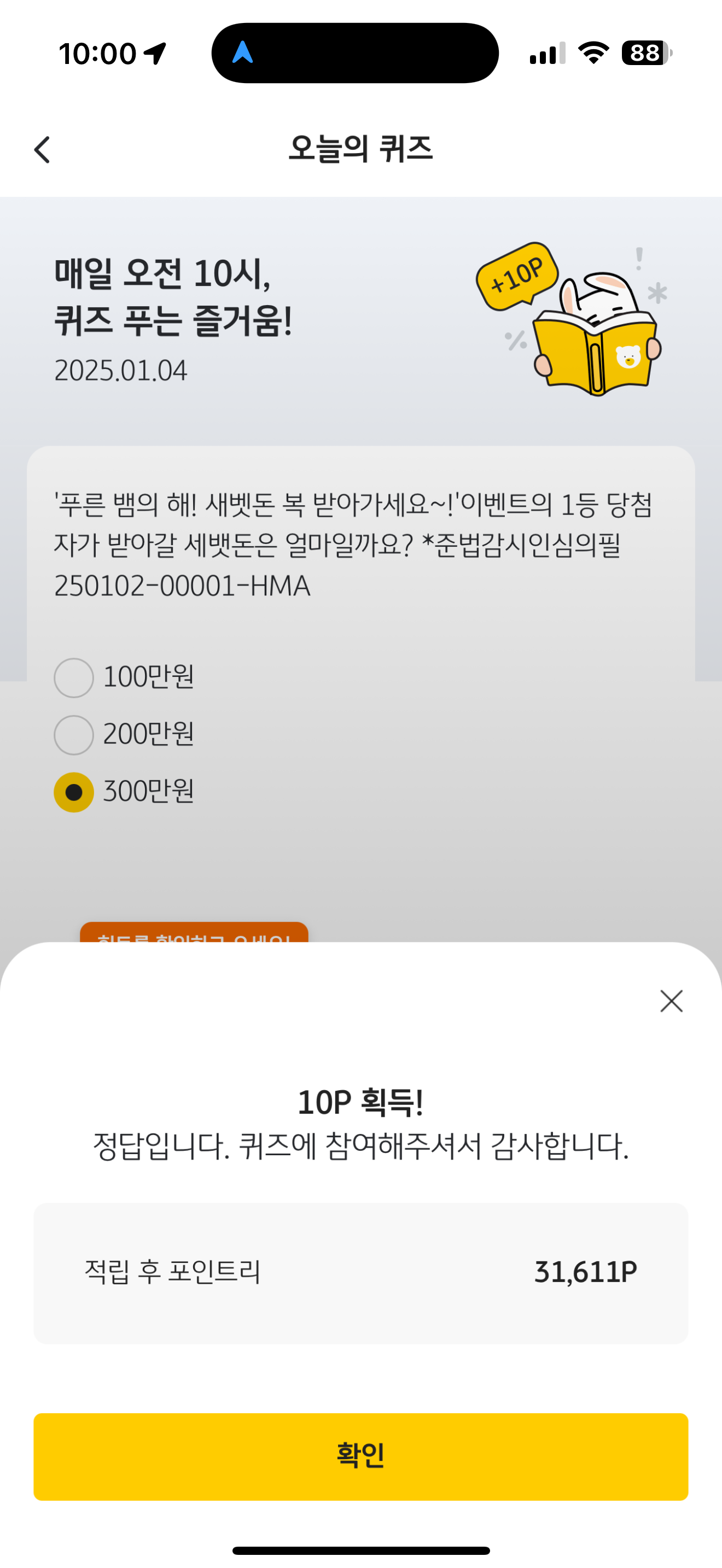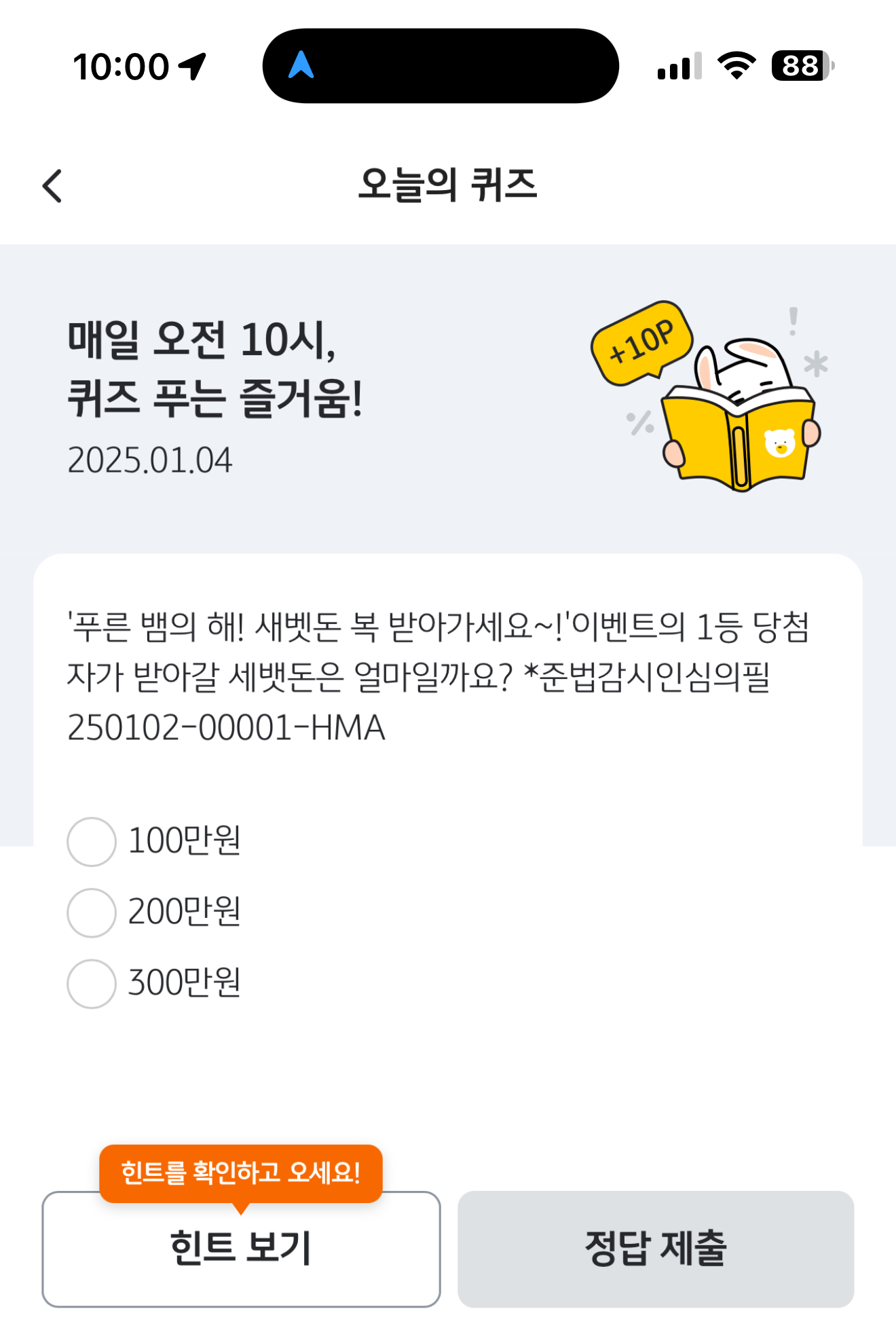 '푸른 뱀의 해! 새벳돈 복 받아가세요~!' 이벤트의 1등 당첨자가 받아갈 세뱃돈은 얼마일까요? *준법감시인심의필250102-00001-HMA 보기는 1. 100만원 2. 200만원 3. 300만원 입니다. 새해를 맞아 파격적인 선물을 제공하고 있습니다. 1등 당첨자가 되면 좋겠지만 꼭 당첨자가 되어 득템하세요