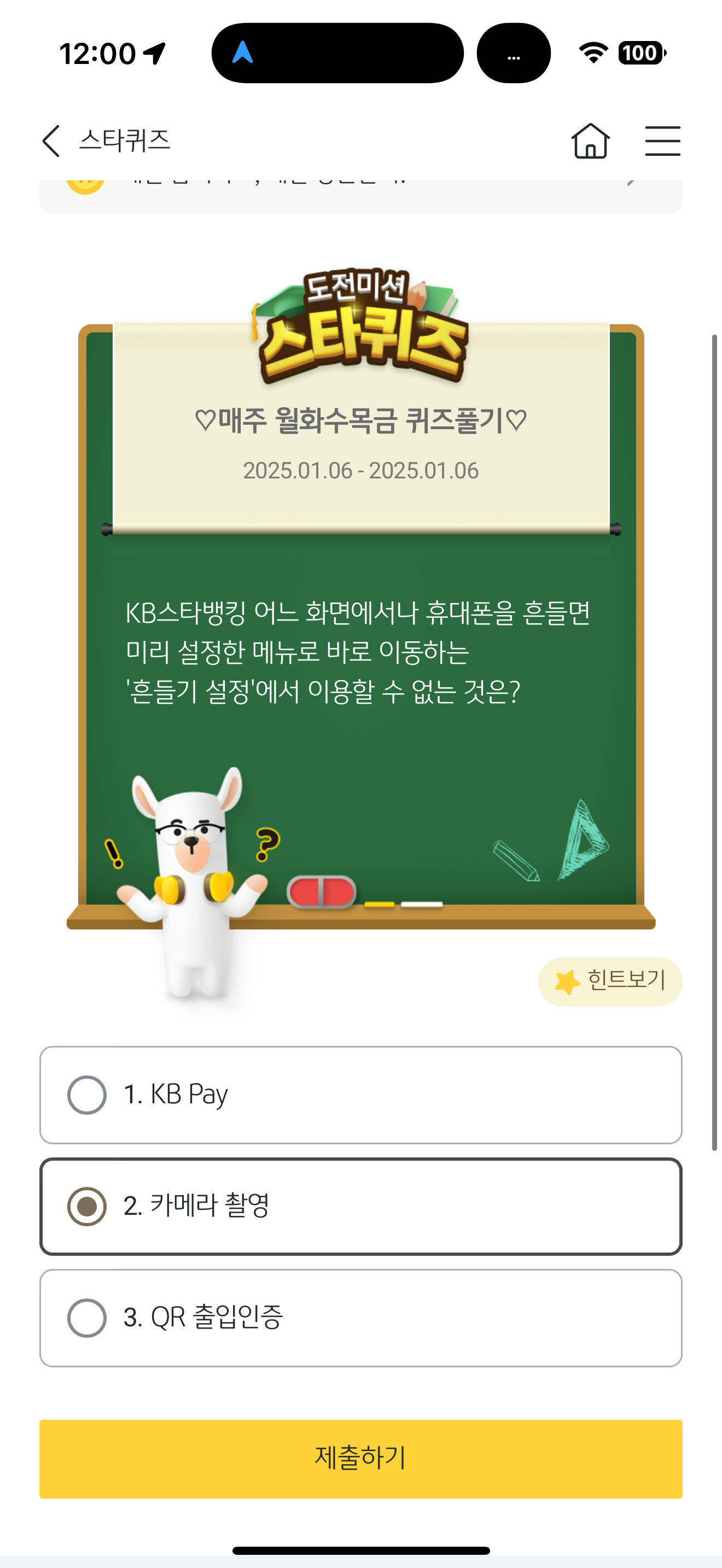 KB스타뱅킹 어느 화면에서나 휴대폰을 흔들면 미리 설정한 메뉴로 바로 이동하는 '흔들기 설정'에서 이용할 수 없는 것은? 보기는 1. KB Pay 2. 카메라 촬영 3. QR 출입인증 입니다. KB스타뱅킹에서는 흔들어서 바로 실행할 수 있는 기능을 선보였습니다. 빠르게 접근할 수 있으니 참고해 두세요