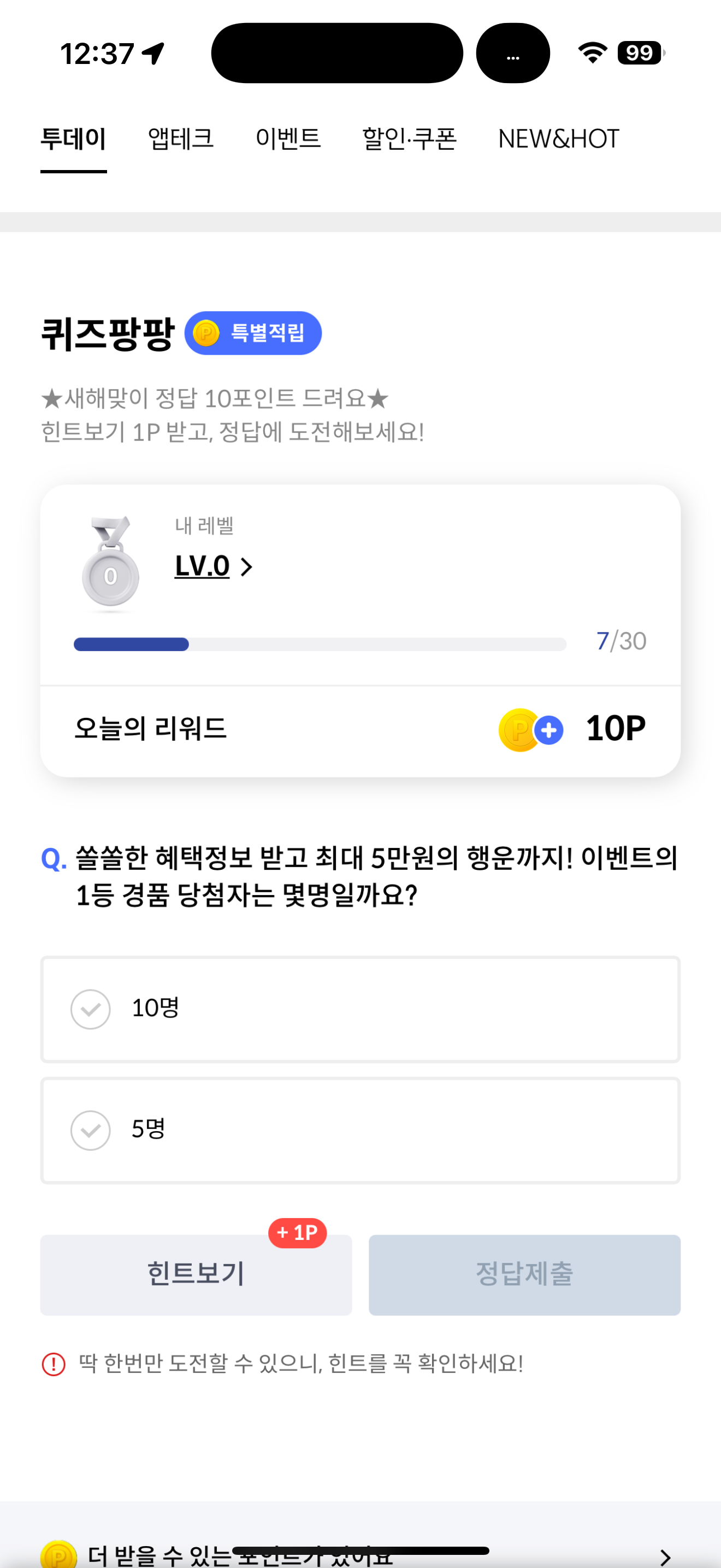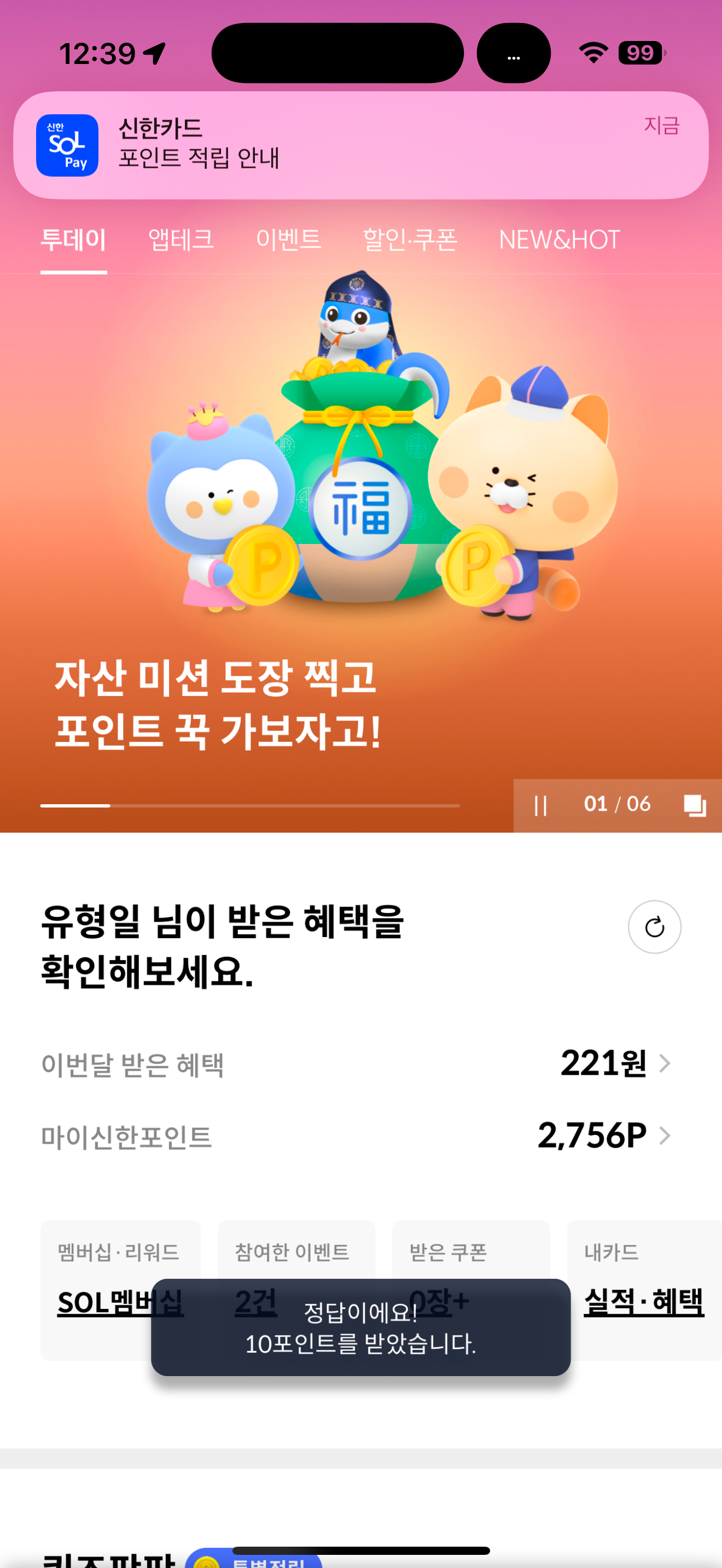 신한카드 퀴즈팡팡 정답은 5명 입니다