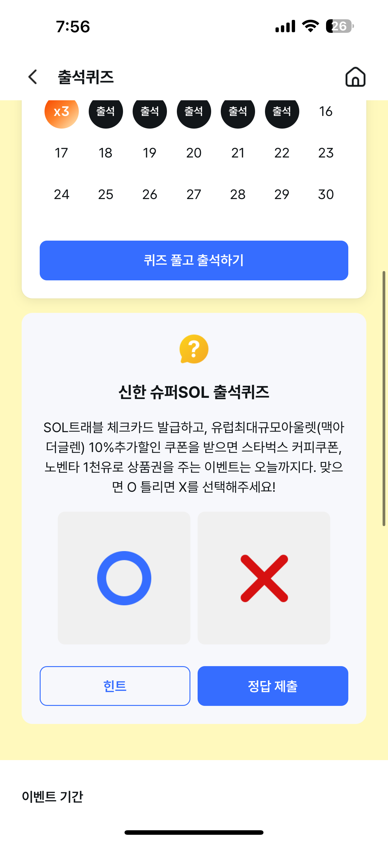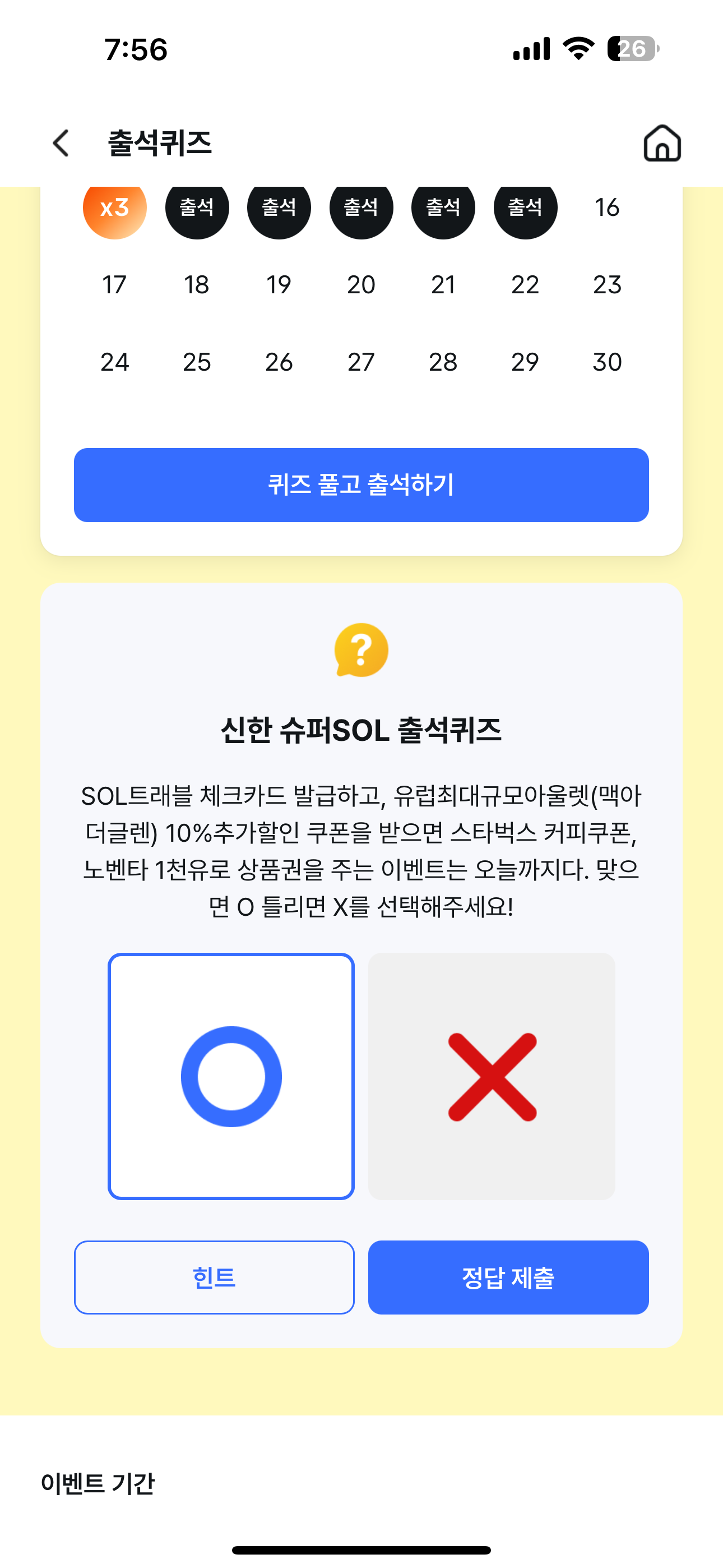 신한 슈퍼SOL 출석퀴즈 정답은 O 입니다