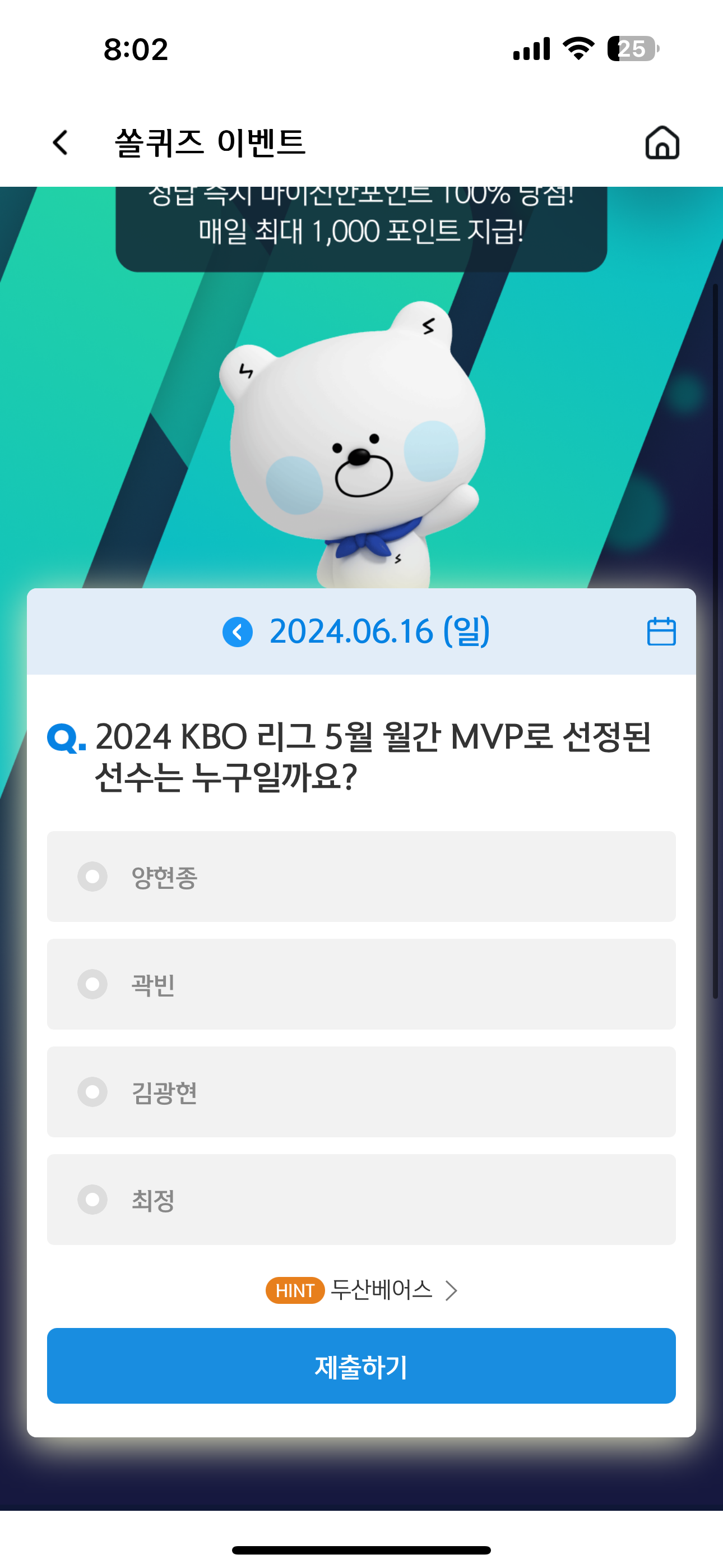 신한 슈퍼SOL 야구/상식 쏠퀴즈 정답은 곽빈 입니다