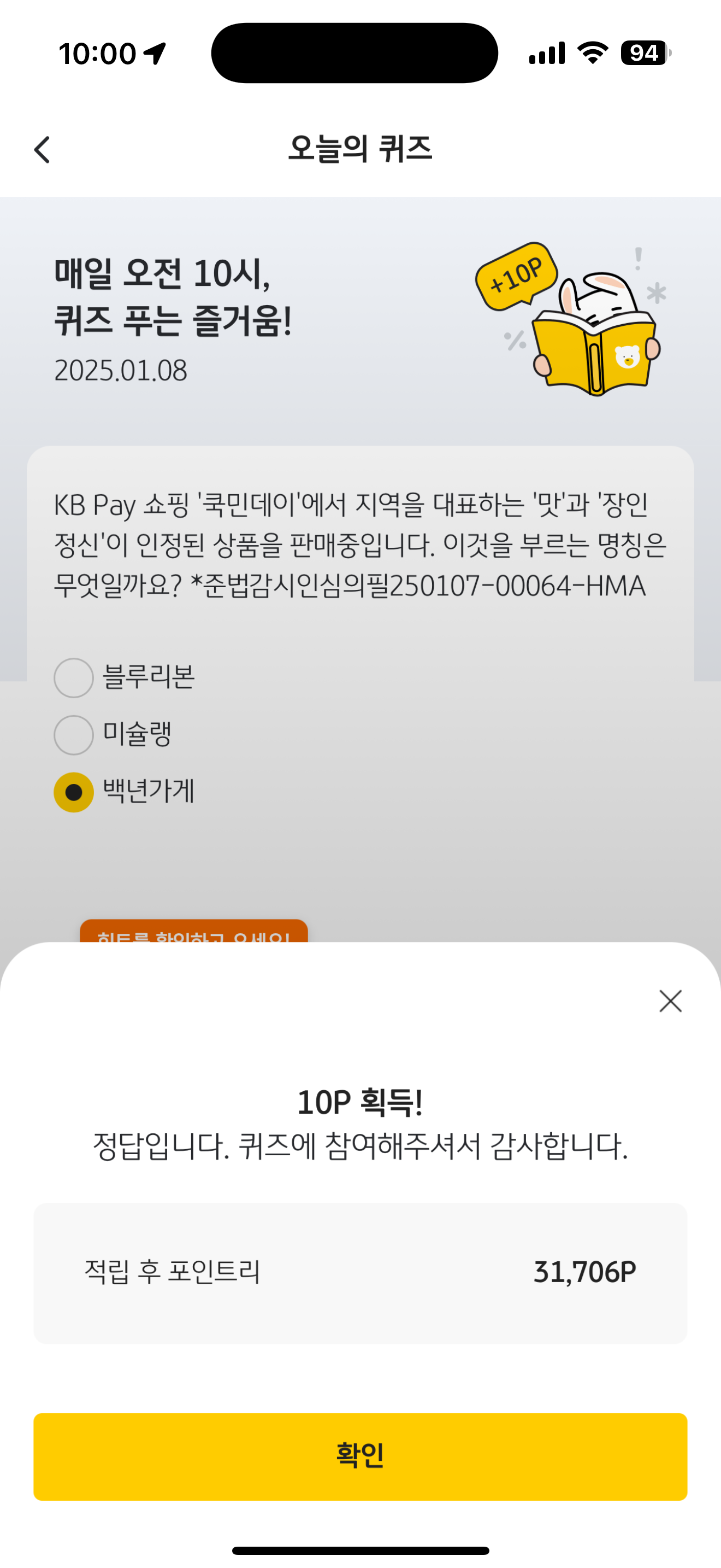 KB pay 오늘의 퀴즈 정답은 백년가게 입니다