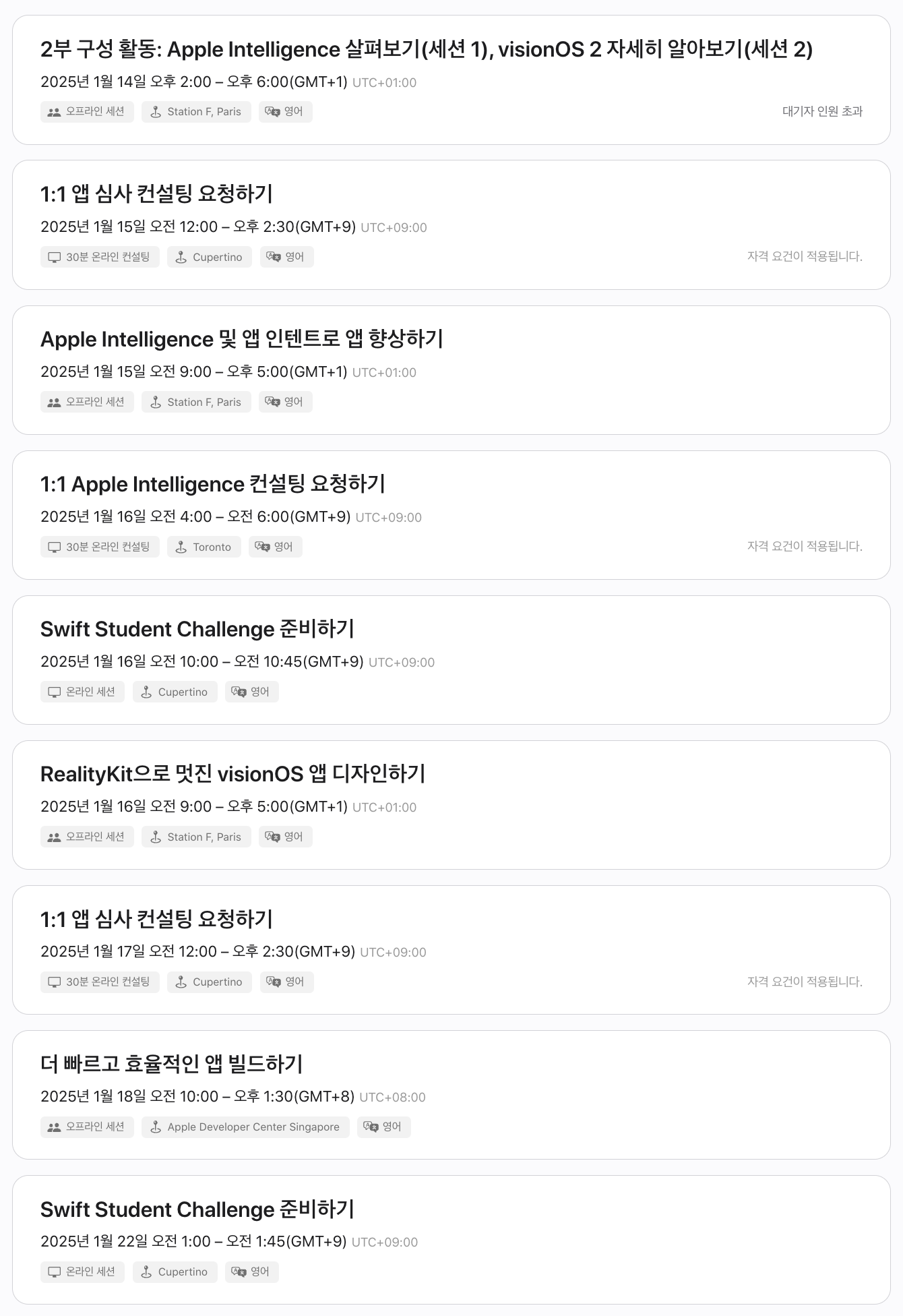 그리고 챌린지 준비를 하실 분들은 애플에서 주최하는 다양한 온라인 세션을 통해 참가 정보에 대해 자세히 알아볼 수 있습니다. 앱개발을 하는데 있어 도움이 되는 세션들이 많이 진행되고 있으니 참여해 보시면 좋을 것 같습니다.