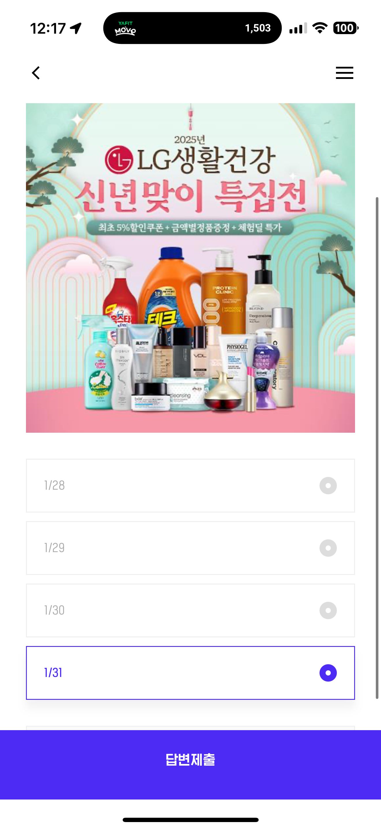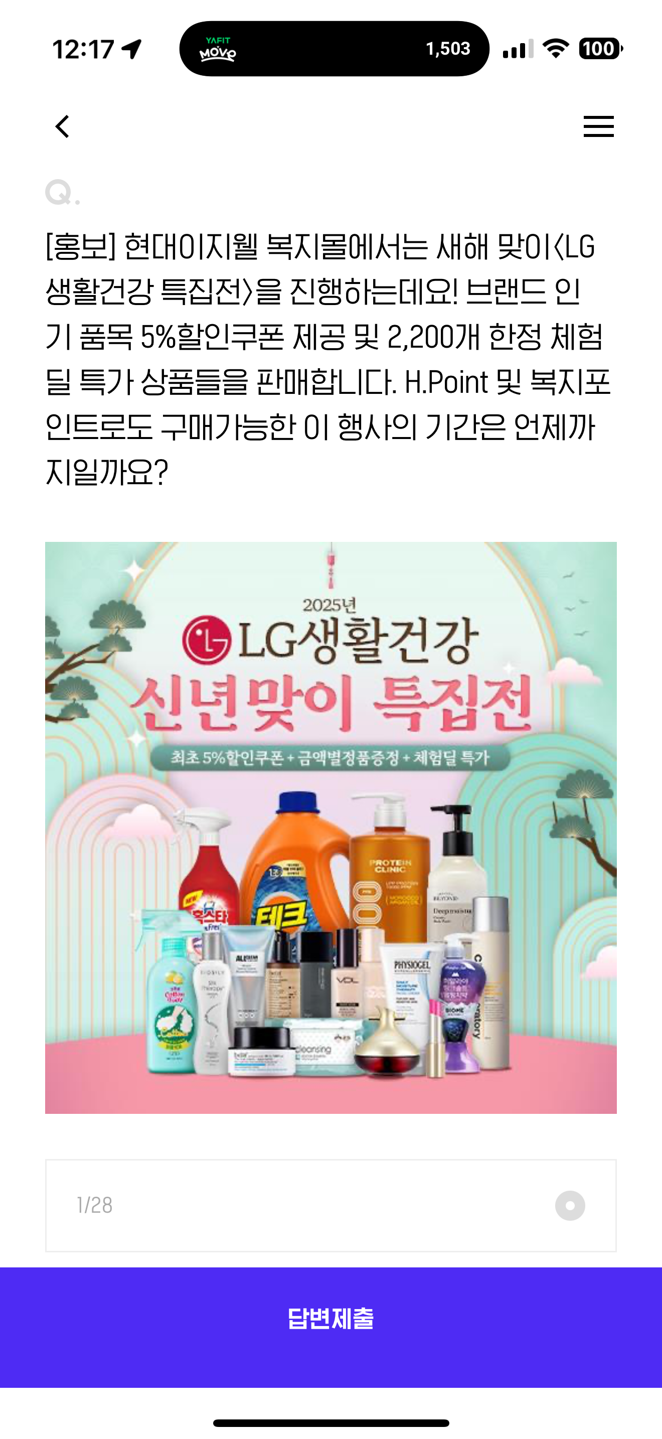 현대이지웰 복지몰에서는 새해 맞이 <LG생활건강 특집전>을 진행하는데요! 브랜드 인기 품목 5%할인쿠폰 제공 및 2,200개 한정 체험딜 특가 상품들을 판매합니다. H.Point 및 복지포인트로도 구매가능한 이 행사의 기간은 언제까지일까요? 보기는 1. 1/28 2. 1/29 3. 1/30 4. 1/31