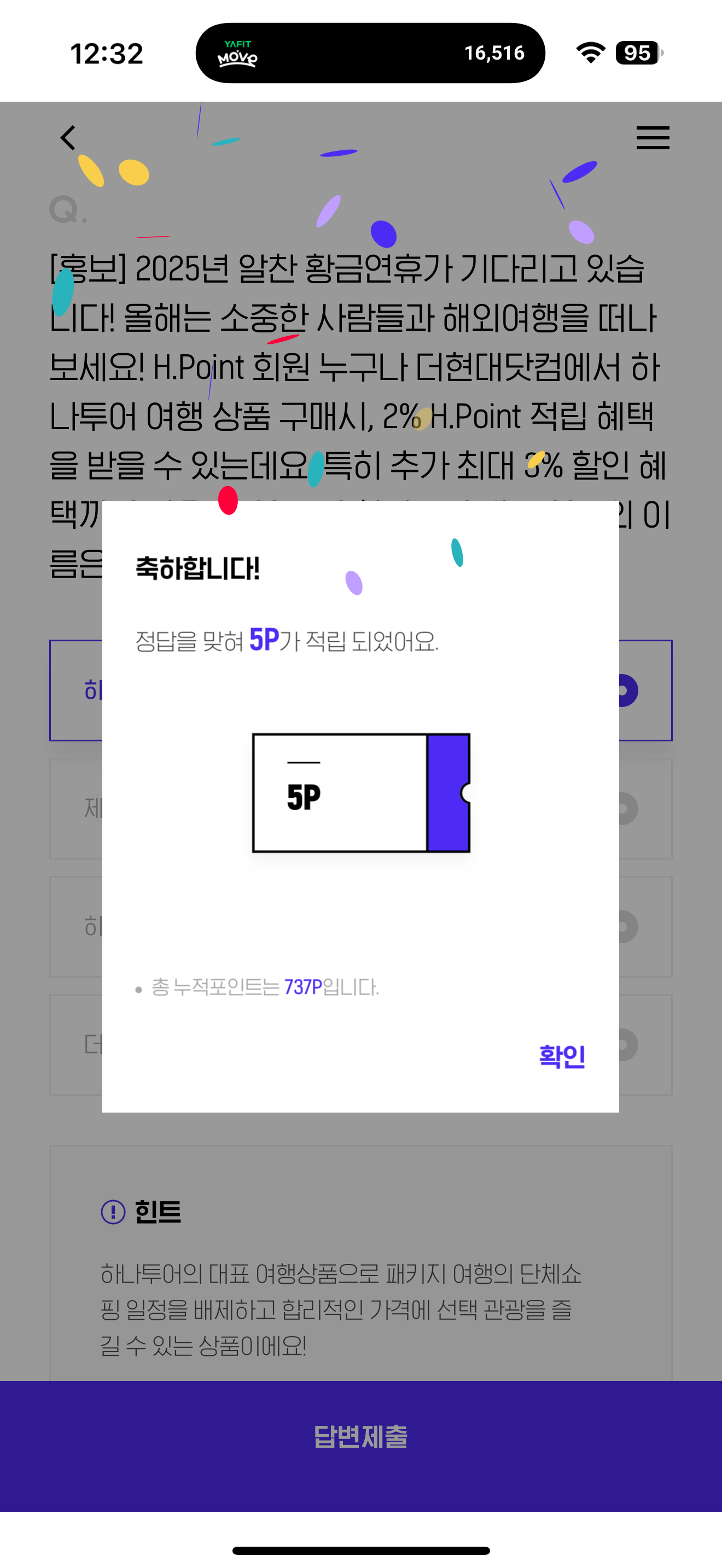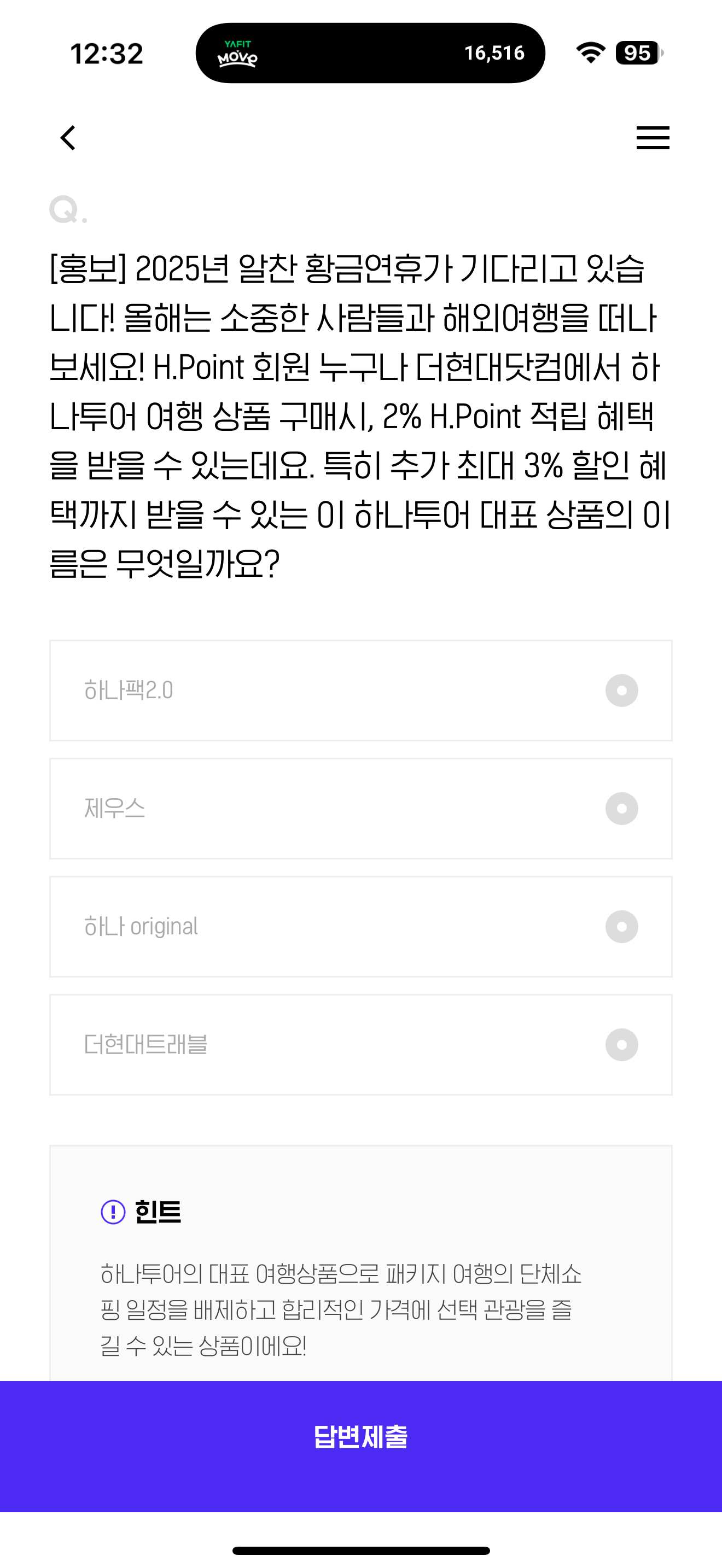 2025년 알찬 황금연휴가 기다리고 있습니다! 올해는 소중한 사람들과 해외여행을 떠나보세요! H.Point 회원 누구나 더현대닷컴에서 하나투어 여행 상품 구매시, 2% H.Point 적립 혜택을 받을 수 있는데요. 특히 추가 최대 3% 할인 혜택까지 받을 수 있는 이 하나투어 대표 상품의 이름은 무엇일까요? 보기는 1. 하나팩2.0 2. 제우스 3. 하나 original 4. 더현대트래블 입니다