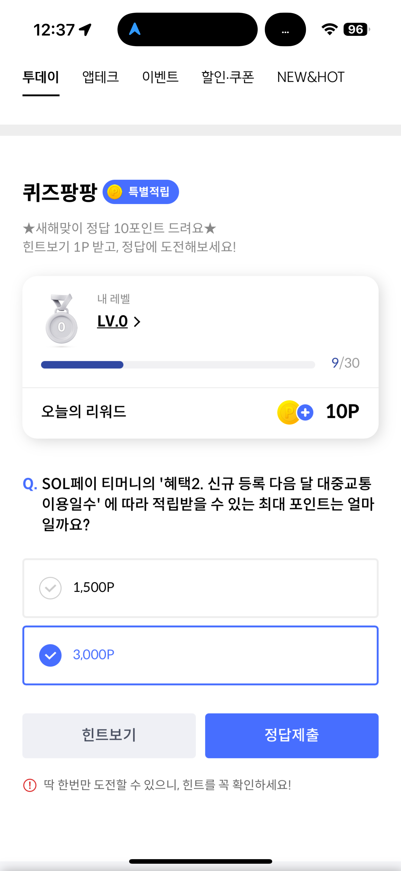 신한카드 퀴즈팡팡 정답은 3,000P 입니다