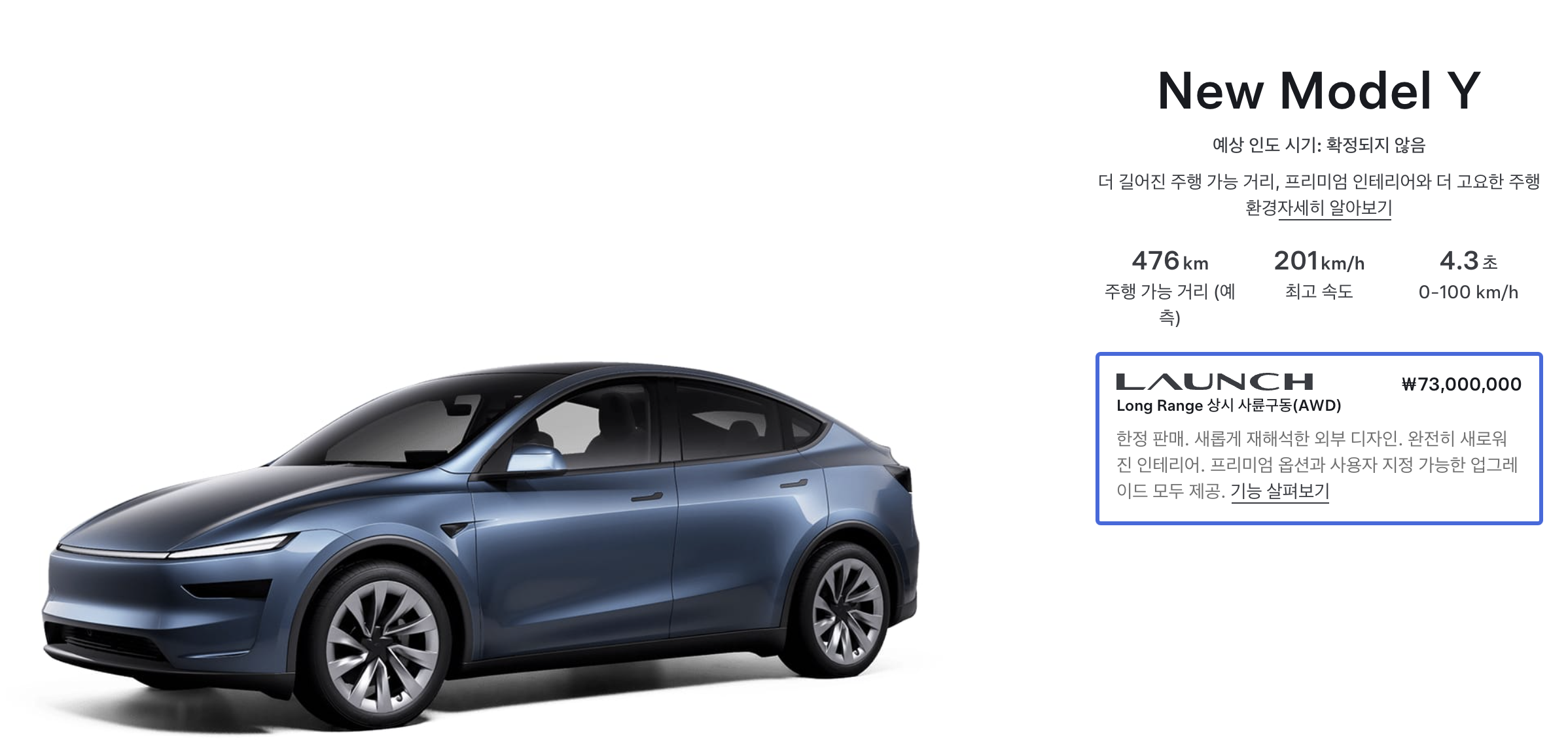 테슬라 뉴 모델Y는 현재 런치 모델만 판매가 되고 있습니다. 가격은 73,000,000원인데요. 가성비 좋게 잘 나온 것 같습니다. 참고로 저렴한 가격의 테슬라 뉴 모델Y RWD도 나올텐데요. 가격이 부담된다면 이 모델을 기다려 보시는 것도 좋습니다. 하지만 전기차는 주행거리가 길면 길수록 좋죠. 왠만하면 테슬라 뉴 모델Y 롱레인지 모델이 좋은 선택이 될 것입니다.