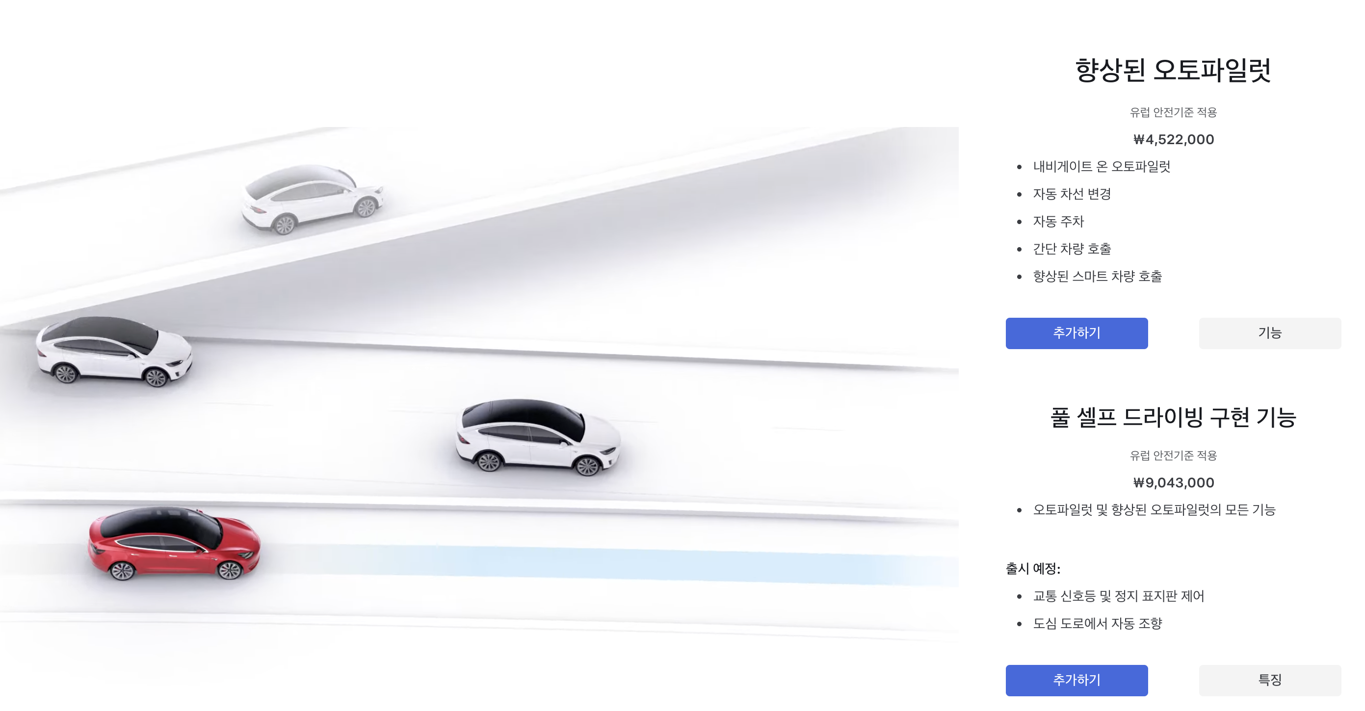 그리고 향상된 오토파일럿과 풀 셀프 드라빙 구현 기능(FSD)이 있는데요. 이건 처음에는 선택하지 않는게 좋습니다. 가격이 올라가면 세금이 더 올라가기 때문입니다. 나중에 얼마든지 추가 가능하니 타다가 넣으면 됩니다. 그리고 우리나라에서는 향상된 오토파일럿만 선택하면 됩니다.