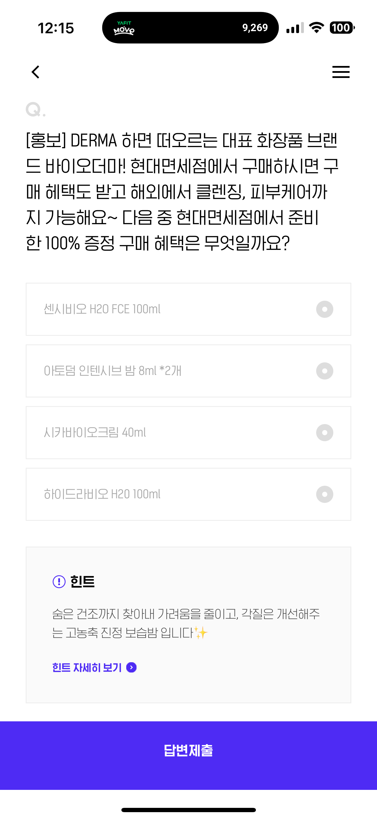 DERMA 하면 떠오르는 대표 화장품 브랜드 바이오더마! 현대면세점에서 구매하시면 구매 혜택도 받고 해외에서 클렌징, 피부케어까지 가능해요~ 다음 중 현대면세점에서 준비한 100% 증정 구매 혜택은 무엇일까요? 보기는 1. 센시비오 H20 FCE 100ml 2. 아토덤 인텐시브 밤 8ml *2개 3. 시카바이오크림 40ml 4. 하이드라비오 H20 100ml 입니다