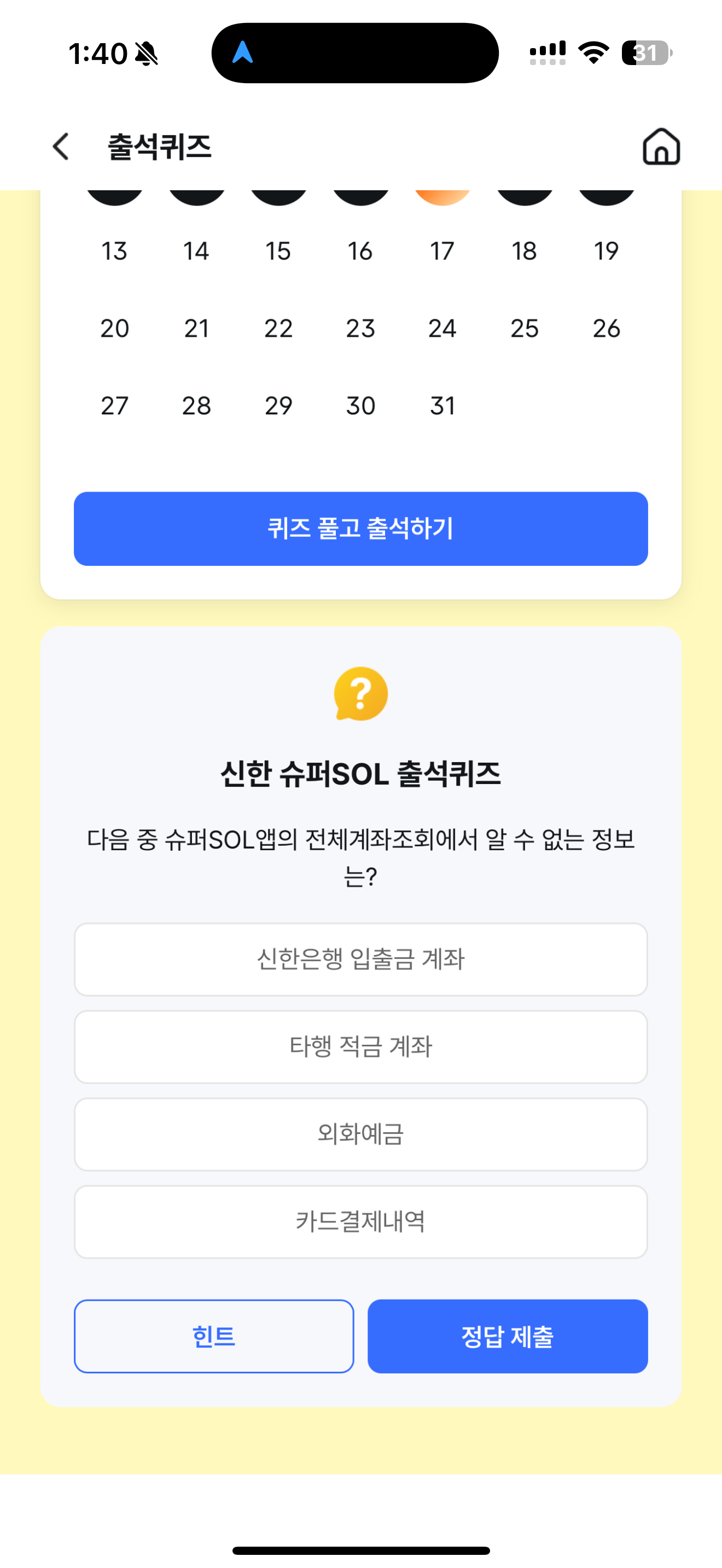 신한 슈퍼SOL 출석퀴즈 정답은 카드결제내역 입니다